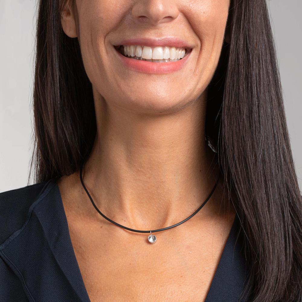 Elegant women's necklace featuring a sleek black rubber cord combined with stainless steel and silver accents. Enhanced by a sparkling zirconia pendant, this piece offers a modern yet timeless look, perfect for adding a subtle touch of sophistication to any outfit.
