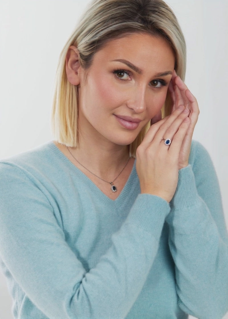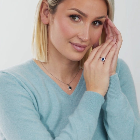 Elegante ciondolo da donna in oro bianco 750, impreziosito da uno zaffiro ovale centrale circondato da diamanti scintillanti. Un gioiello raffinato e luminoso, ideale per aggiungere un tocco di classe e splendore ad ogni occasione speciale.