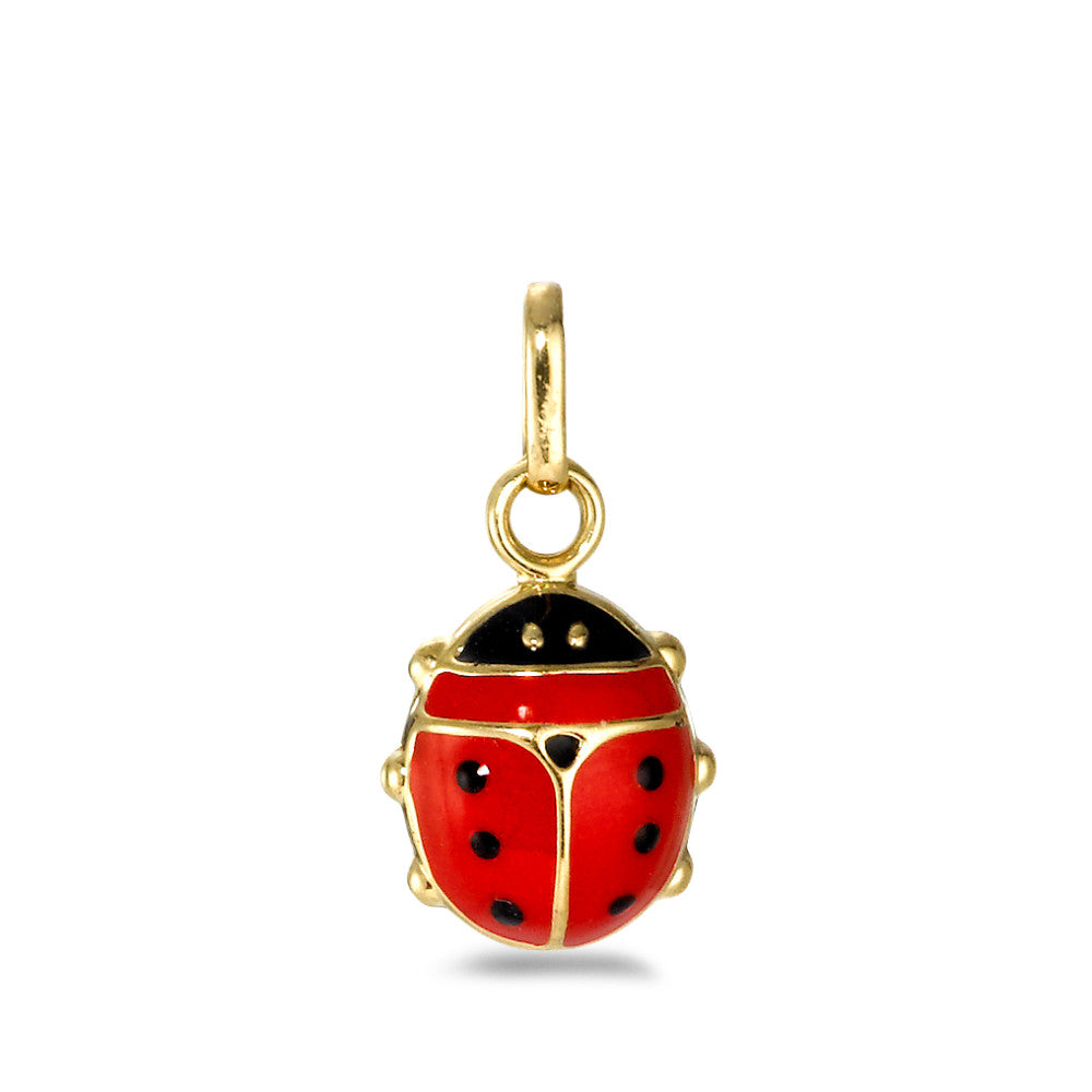 Zauberhafter Mädchen-Anhänger aus 375er Gelbgold in Form eines bunten Marienkäfers. Der detailreich gestaltete Glücksbringer mit roter und schwarzer Emaille ist ein liebevolles Geschenk für Mädchen und ein süßes Accessoire für jeden Tag.