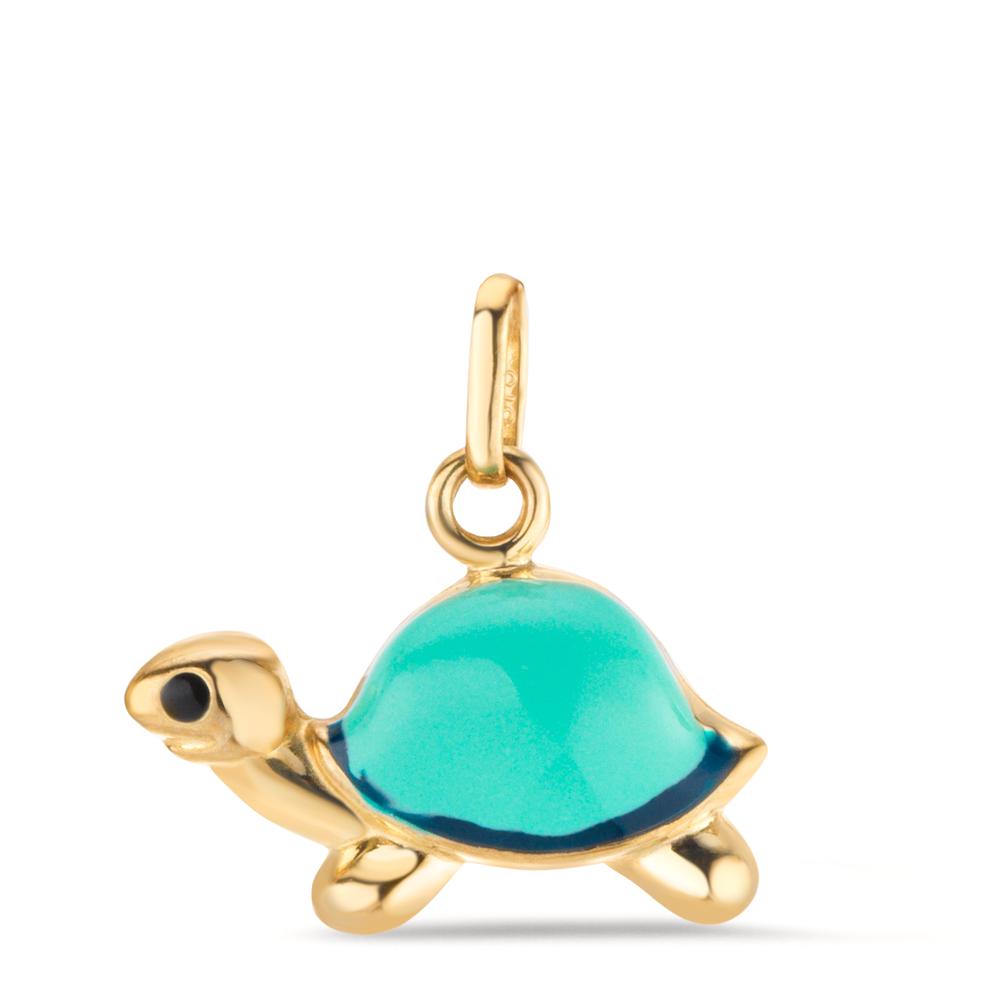 Zauberhafter Mädchen-Anhänger aus hochwertigem 375er Gelbgold, gestaltet als niedliche Schildkröte. Das farbenfrohe Design mit türkisem Panzer bringt kindlichen Charme und Eleganz zugleich. Ein besonderes Schmuckstück, das jedem Outfit liebevollen Akzent verleiht. Ideal als Geschenk oder für besondere Anlässe.