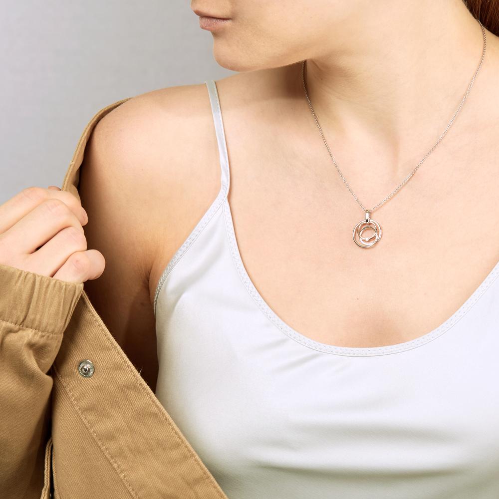 Eleganter Damenanhänger aus 375 Weiß- und Rotgold mit funkelndem Diamant. Die harmonisch ineinander verschlungenen Ringe symbolisieren Verbundenheit und sorgen für ein edles und zeitloses Design. Perfekt für besondere Anlässe oder den täglichen Schmuckmoment.