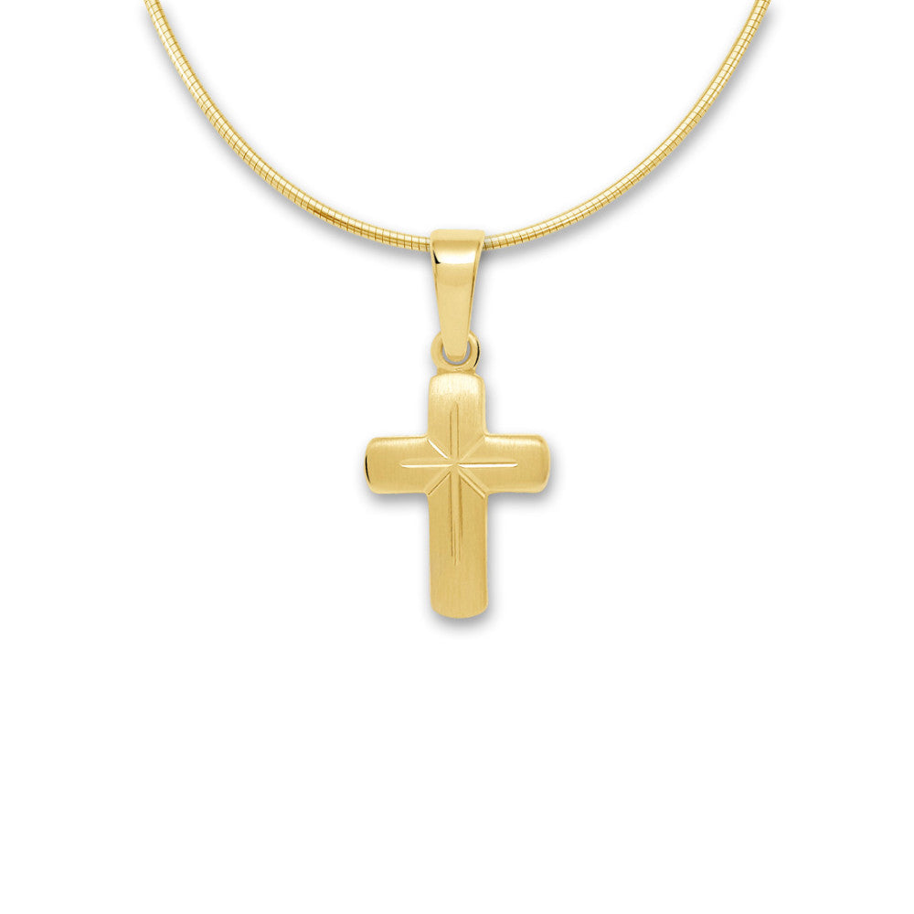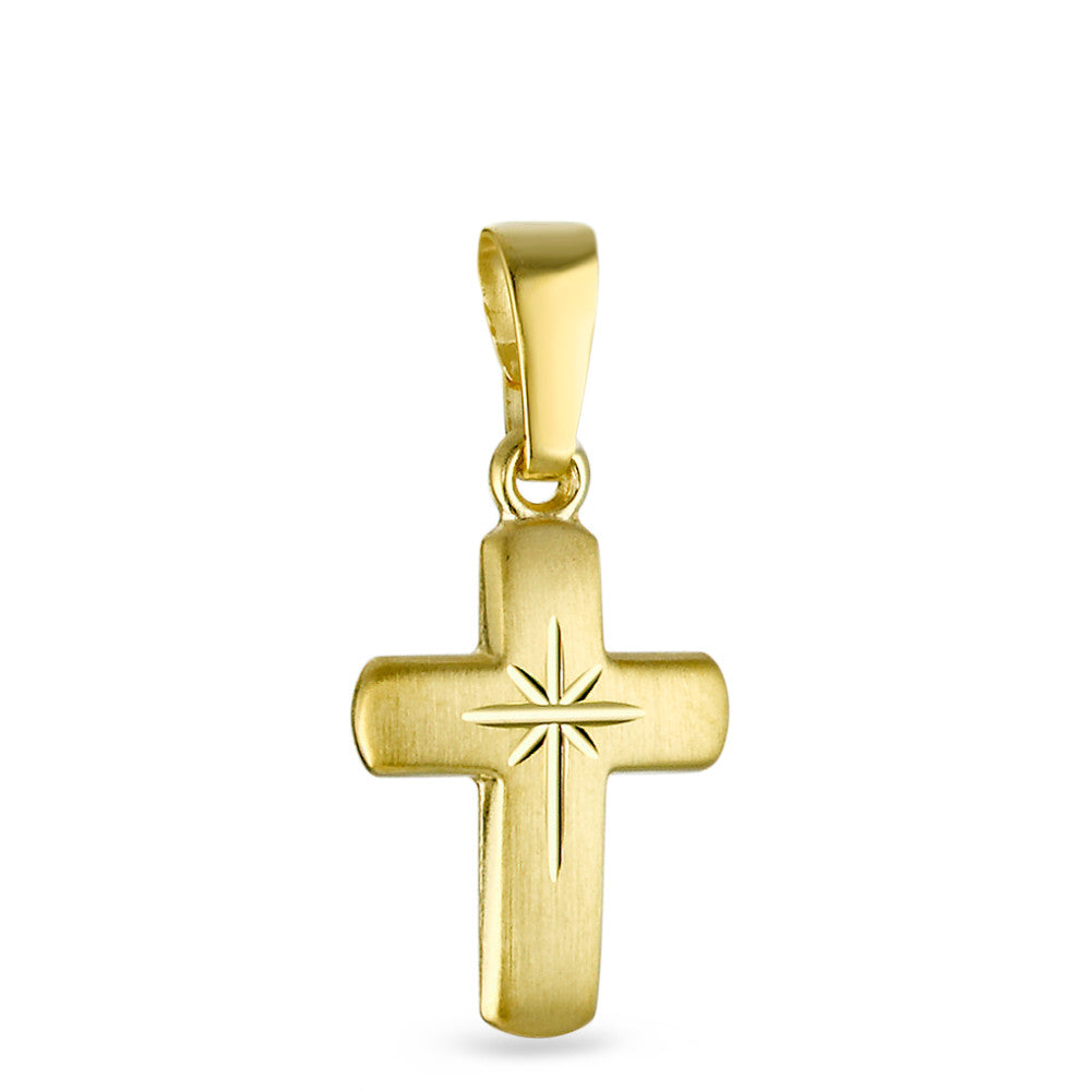 Edler Anhänger aus 750er Gelbgold in Kreuzform mit feiner Stern-Gravur in der Mitte. Dieses zeitlose Schmuckstück verbindet klassischen Stil mit spiritueller Bedeutung und eignet sich perfekt als Geschenk oder persönliches Accessoire für jeden Anlass.