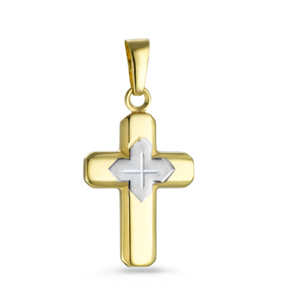 Eleganter Anhänger in Kreuzform aus hochwertigem 750er Gelbgold. Das feine Design mit zentriertem Weißgold-Detail verleiht dem Schmuckstück eine besondere Ausstrahlung. Ein zeitloses Accessoire, das zu jedem Anlass getragen werden kann. Perfekt als Geschenk oder für den eigenen Stil.