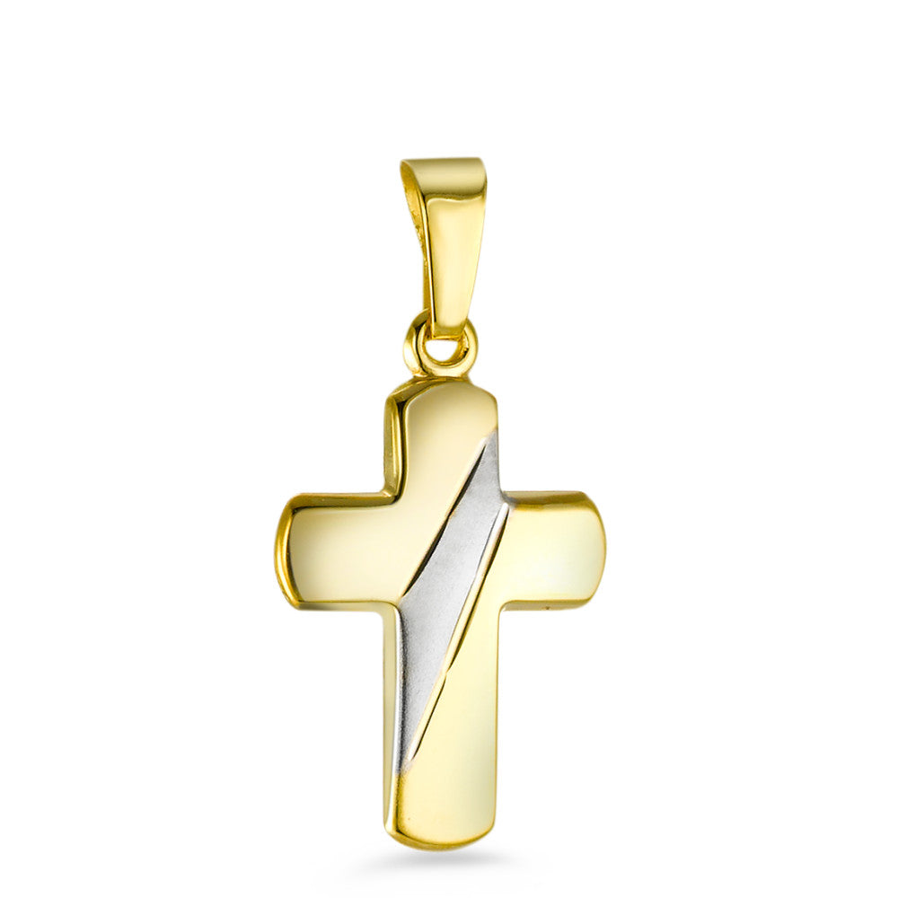 Zeitlos eleganter Kreuz-Anhänger aus hochwertigem 750er Gelbgold mit einer dezenten weißen Gold-Applikation. Ein stilvolles Accessoire, das Glauben und Stil perfekt vereint. Ideal als Geschenk oder zum täglichen Tragen. Größe und Gewicht variieren leicht.