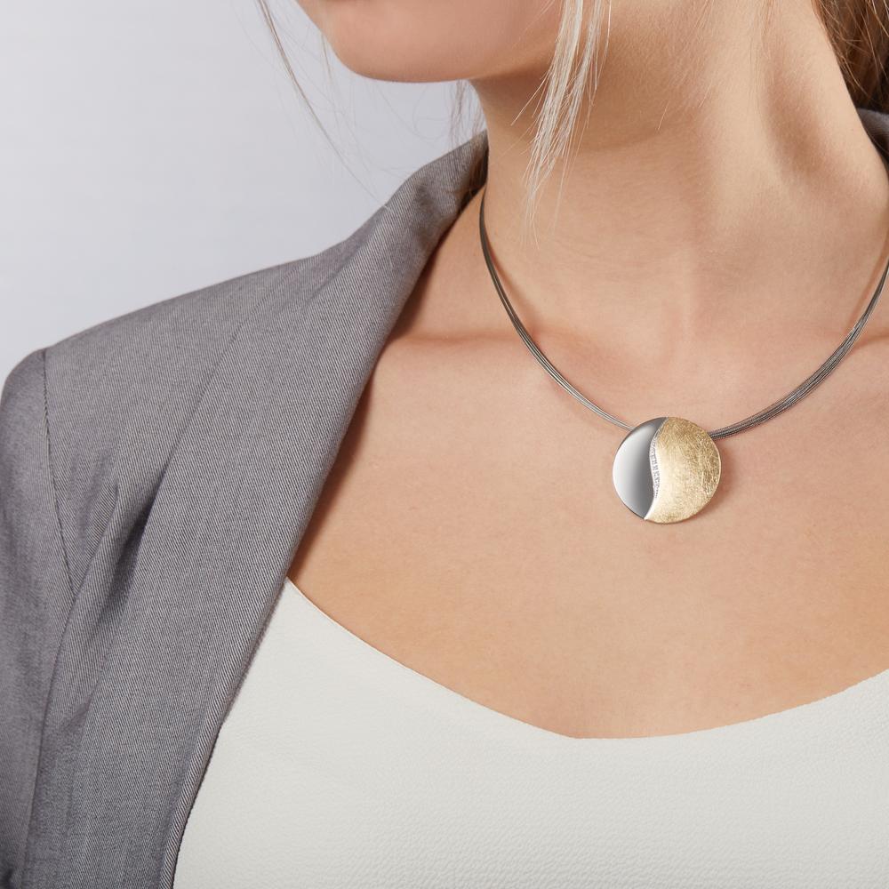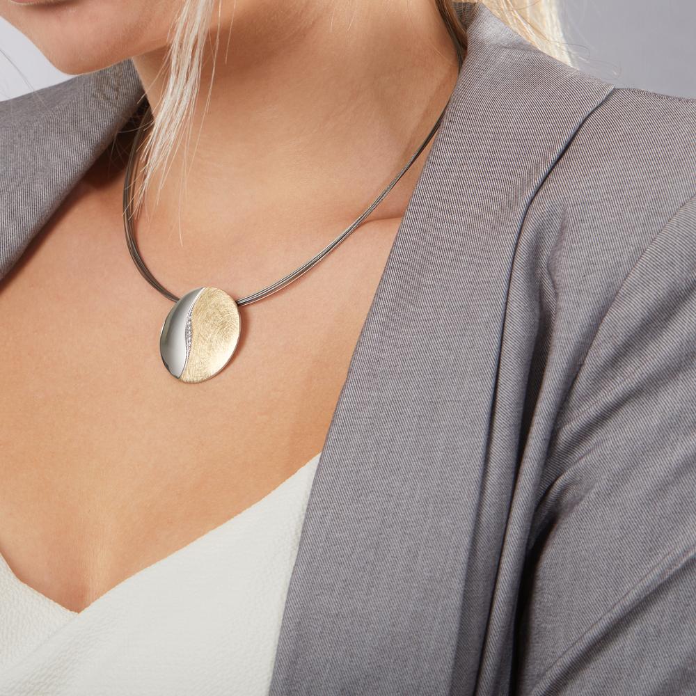 Moderner Damenanhänger aus hochwertigem Edelstahl mit einem eleganten zweifarbigen Design in Gold- und Silberoptik. Zarte Zirkonia-Steine verleihen dem Schmuckstück einen funkelnden Glanz. Perfekt für besondere Anlässe oder den täglichen Stil.