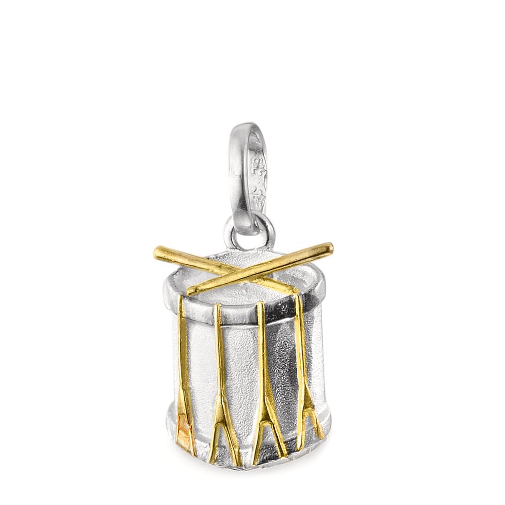 Moderner Herren-Anhänger in Form einer Trommel aus hochwertigem Silber. Das Design wird durch goldfarbene Details an Schlägeln und Halterungen akzentuiert, was dem Schmuckstück einen dynamischen und edlen Charakter verleiht. Ideal für Musikliebhaber und stilbewusste Männer.