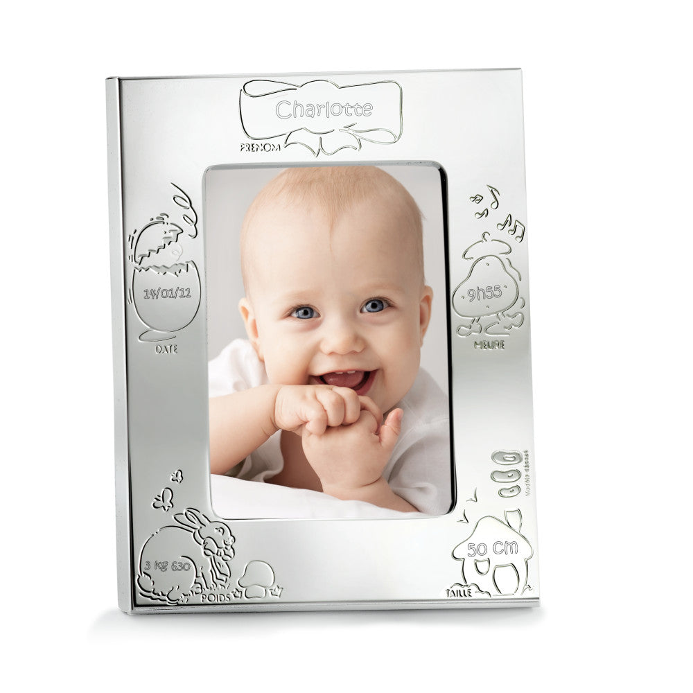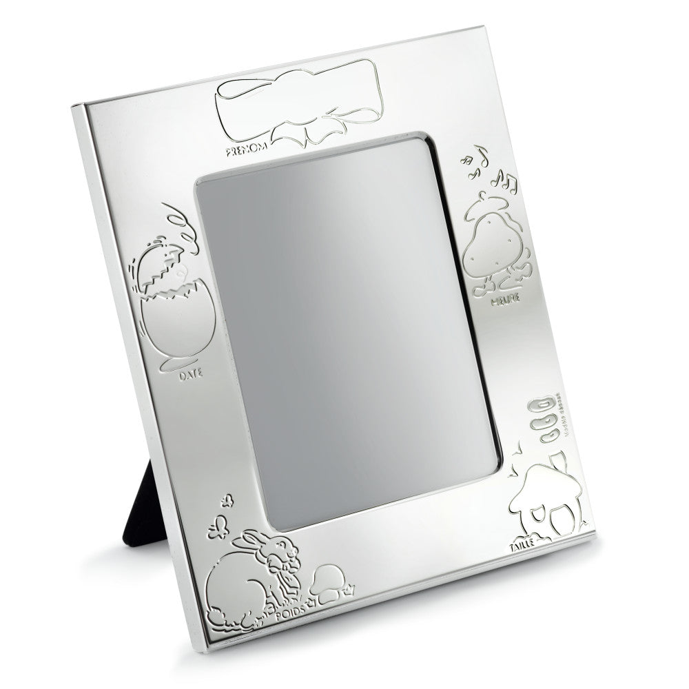 Edler Baby-Fotorahmen aus poliertem Metall mit niedlichen Gravuren. Perfekt, um die schönsten Momente Ihres Babys stilvoll zu präsentieren. Ideal als Geschenk zur Geburt oder Taufe. Maße passend für ein 10x15 cm Foto. Ein Erinnerungsstück voller Liebe und Charme.