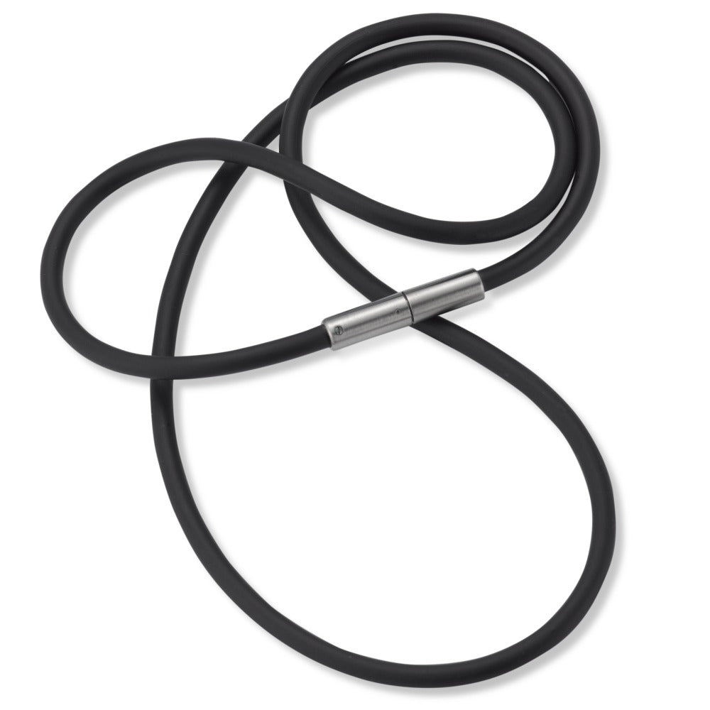 Modernes Collier aus schwarzem Kautschuk mit hochwertigem Verschluss aus Edelstahl. Zeitloses Design für jeden Anlass, angenehm zu tragen und äußerst robust. Perfektes Accessoire für einen sportlich-eleganten Look. Ideal einzeln oder mit Anhänger kombinierbar.