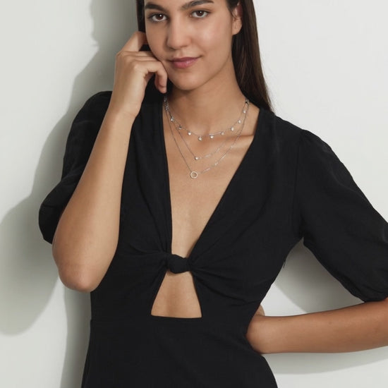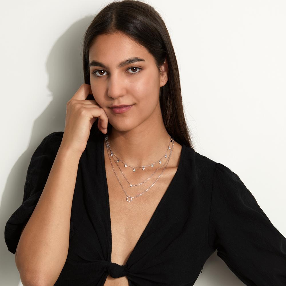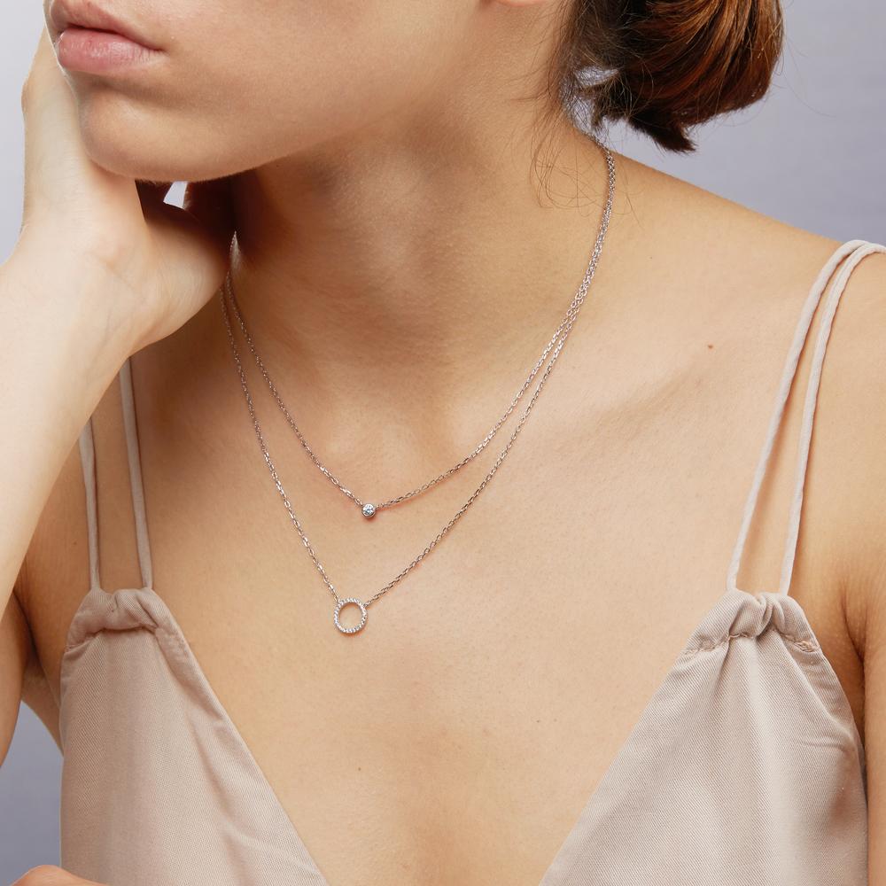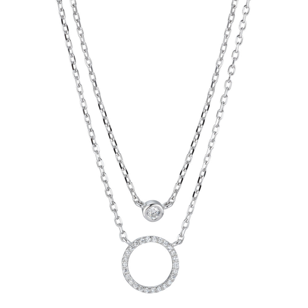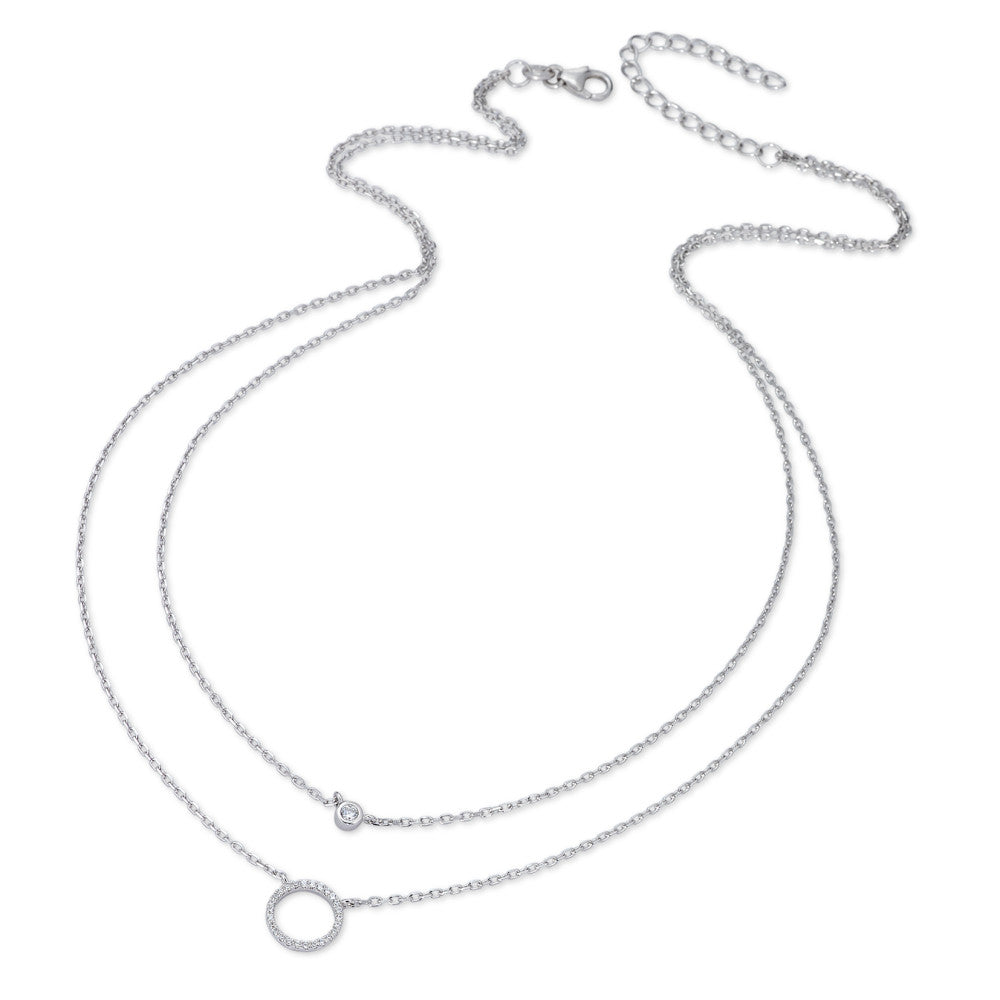 Elegantes Damen-Collier aus glänzendem Silber mit funkelnden Zirkonia-Steinen. Das doppelte Ketten-Design mit einem kleinen Zirkonia und einem mit Steinen besetzten Kreis setzt stilvolle Akzente und macht das Schmuckstück zum perfekten Begleiter für jeden Anlass.