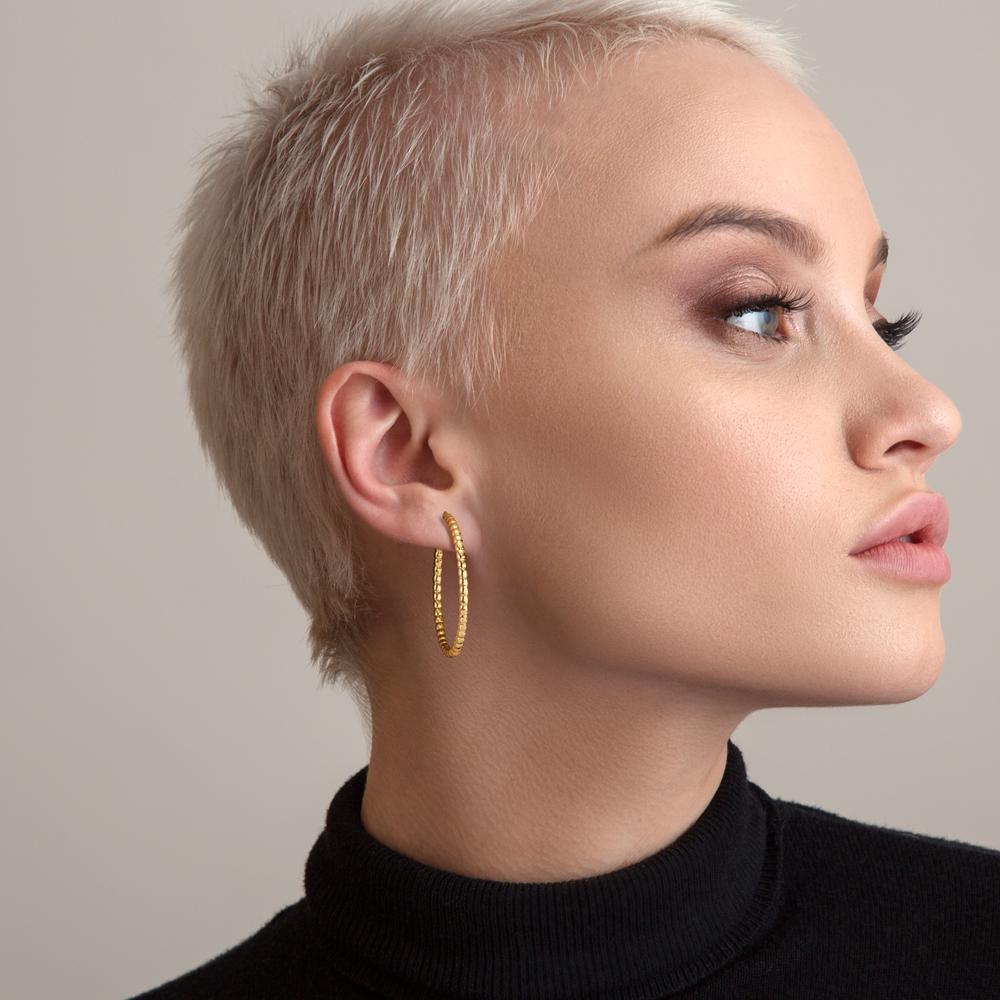 Elegante Damen-Creolen aus hochwertigem Silber mit goldener Vergoldung. Das strukturierte Design verleiht jedem Outfit einen modernen und stilvollen Akzent. Leicht, langlebig und perfekt für jeden Anlass – ein zeitloses Schmuckstück für Ihre Sammlung.