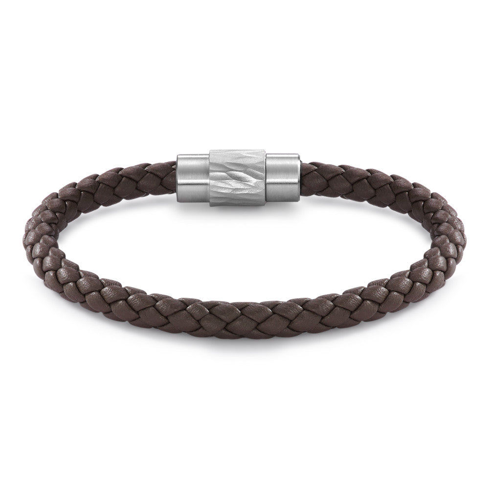 Stilvolles Herren-Armband aus geflochtenem Leder in Braun, kombiniert mit einem robusten Edelstahl-Verschluss. Dieses Accessoire vereint maskuline Eleganz und langlebige Materialien – perfekt für den Alltag oder besondere Anlässe. Zeitloses Design für jeden Look.