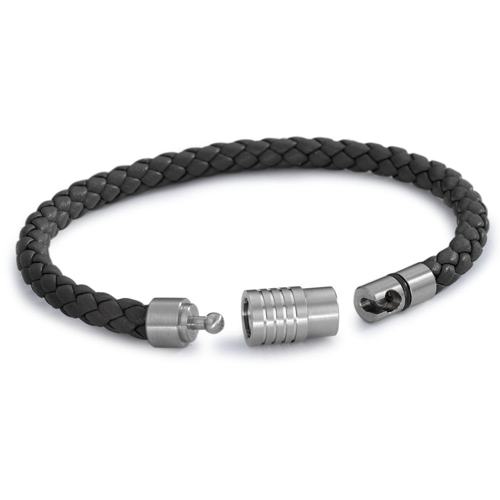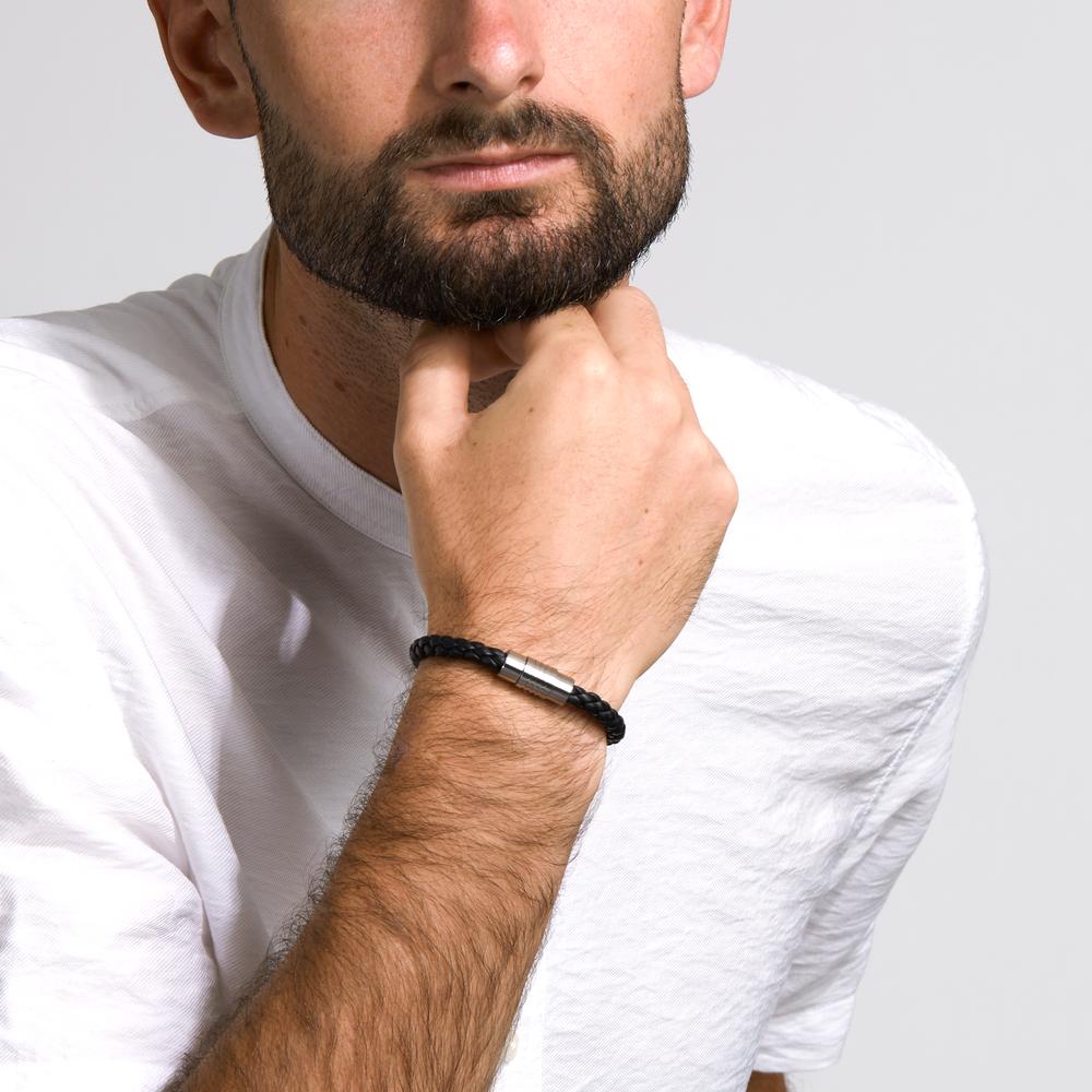 Modisches Armband aus geflochtenem schwarzem Leder mit stabilem Edelstahlverschluss. Das elegante Design kombiniert robusten Tragekomfort mit zeitloser Optik und macht es zum perfekten Accessoire für jeden Anlass. Ideal für stilbewusste Männer und Frauen.