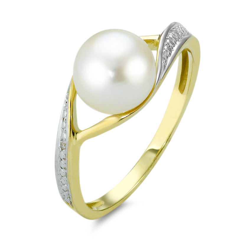 Fingerring 375/9 K Gelbgold Diamant 0.01 ct, 2 Steine, w-si Süsswasserzuchtperle weiss, 2 Perlen, 8 mm