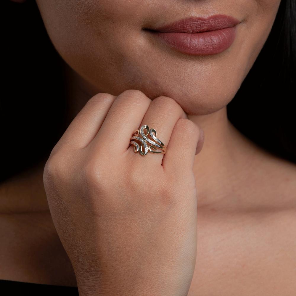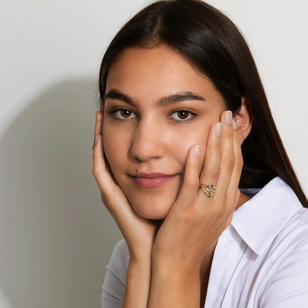 Eleganter Damenring aus 375er Gelbgold mit kunstvollen, fließenden Linien, verziert mit funkelnden Diamanten. Dieser filigrane Fingerring besticht durch sein außergewöhnliches Design und verleiht jedem Outfit einen edlen, zeitlosen Glanz. Perfekt für besondere Anlässe.