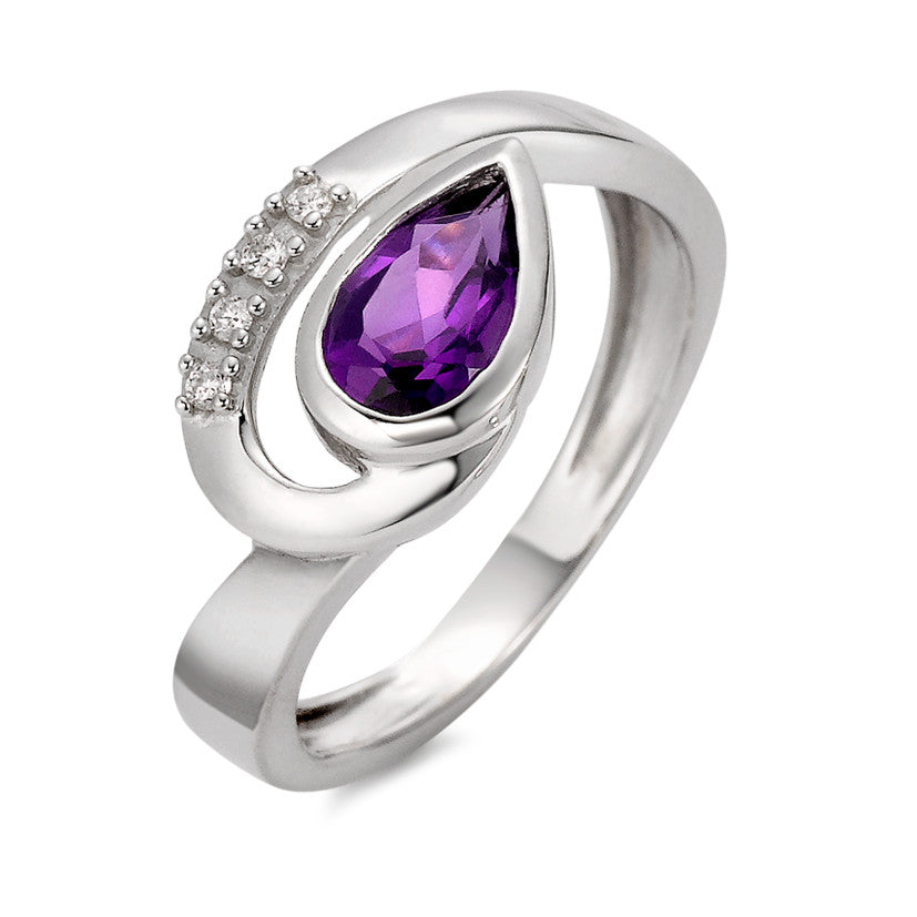 Eleganter Damenring aus 750er Weißgold mit einem tropfenförmigen Amethyst als Blickfang. Veredelt wird das Design durch funkelnde Brillanten, die dem Ring eine besondere Raffinesse verleihen. Ein zeitlos schönes Schmuckstück für jeden Anlass.
