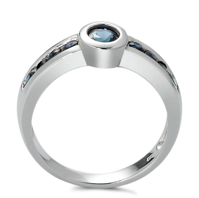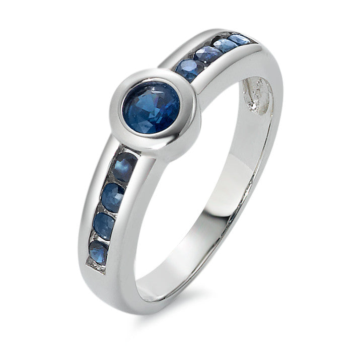 Eleganter Damenring aus 750er Weißgold, verziert mit einem strahlenden rundgeschliffenen Saphir in der Mitte und weiteren kleinen Saphiren entlang des Rings. Ein zeitloses Schmuckstück, das durch hochwertigen Glanz und edle Farbnuancen besticht – perfekt für jeden Anlass.