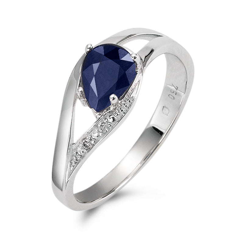 Fingerring 750/18 K Weissgold Saphir blau, Tropfen, Diamant weiss, 0.01 ct, w-pi1