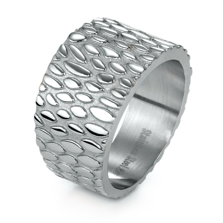 Moderner Damenring aus hochwertigem Edelstahl mit auffälliger, strukturierter Oberfläche. Der breite Ring besticht durch sein schimmerndes Design und ist zugleich robust und hautfreundlich. Ein zeitloses Accessoire für jeden Anlass, das Eleganz und Stil verbindet.