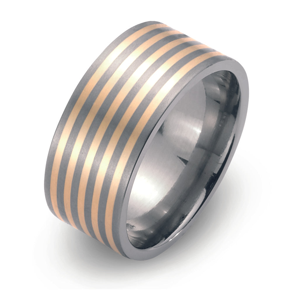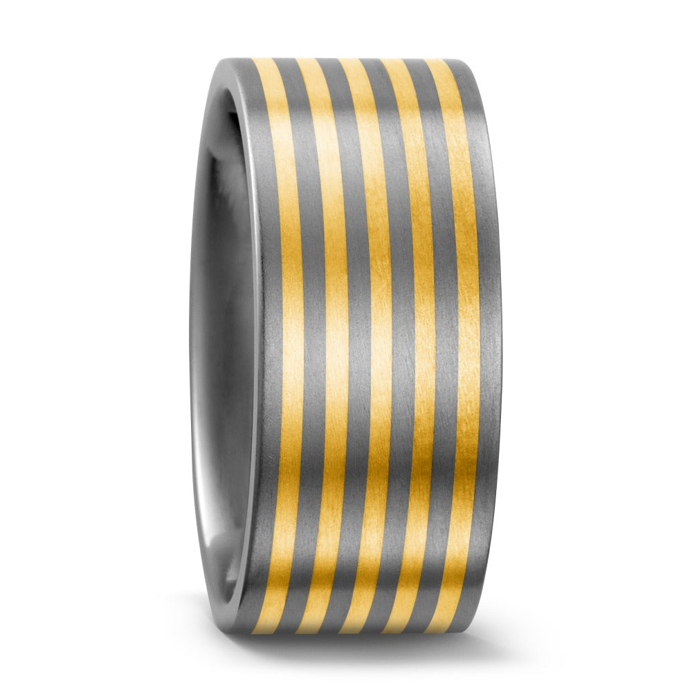 Moderner Herren Fingerring aus robustem Titan mit eleganten Streifen aus 750er Gelbgold. Die Kombination verleiht dem Ring eine maskuline und zugleich edle Optik. Ideal für stilbewusste Männer, die Wert auf Qualität und Design legen. Perfekt für jeden Anlass.
