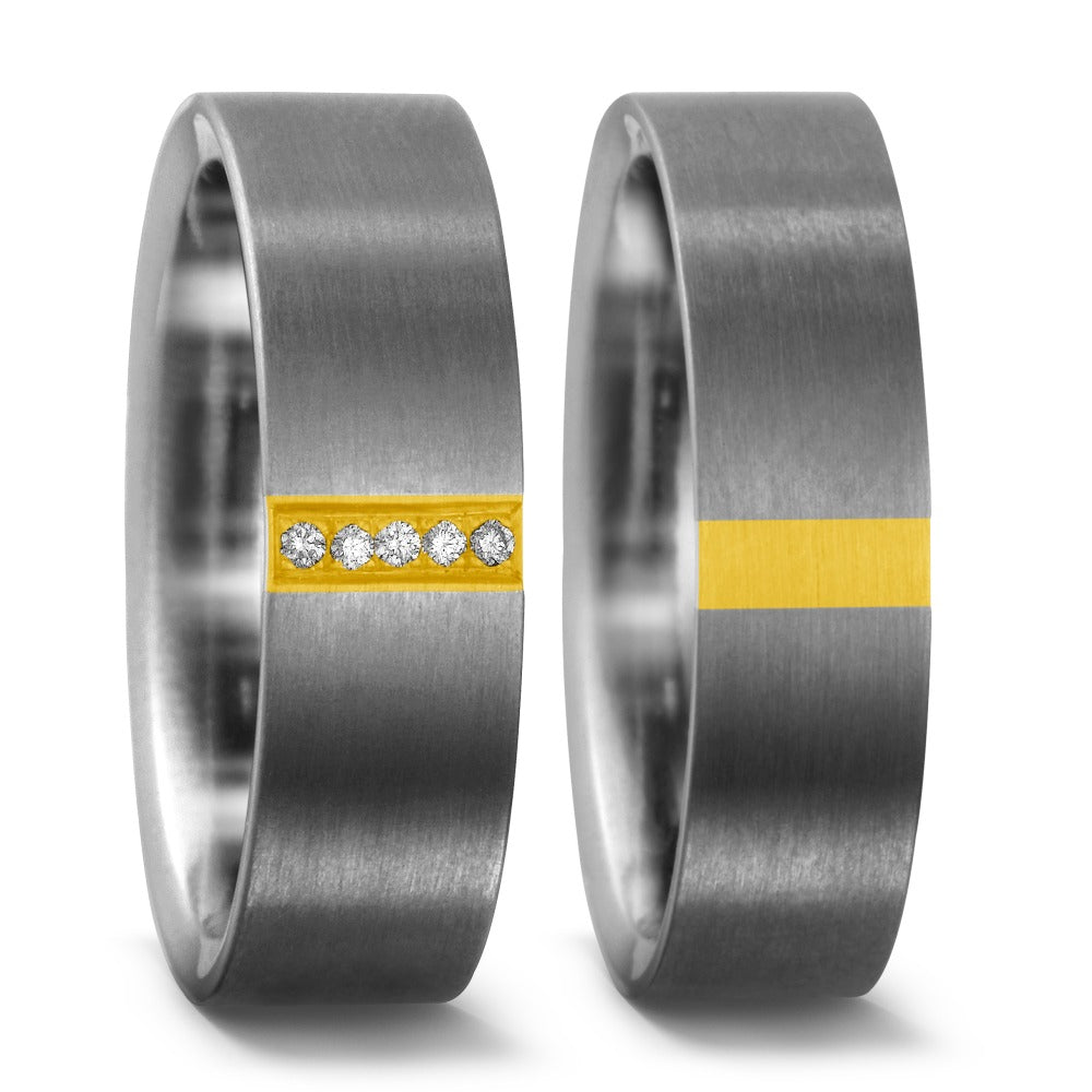 Moderner Fingerring aus widerstandsfähigem Titan mit einem eleganten Einsatz aus 750er Gelbgold. Der matte Ring überzeugt durch sein zeitloses Design und hochwertigen Materialmix – ideal für alle, die einen stilvollen und langlebigen Begleiter suchen. Perfekt für jeden Anlass.