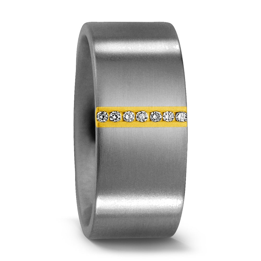 Moderner Damenring aus mattiertem Titan mit eleganter 750 Gelbgold-Einlage. Verziert mit sieben funkelnden Diamanten, die dem Ring zeitlose Eleganz und Raffinesse verleihen. Ein hochwertiges Schmuckstück für stilbewusste Frauen.