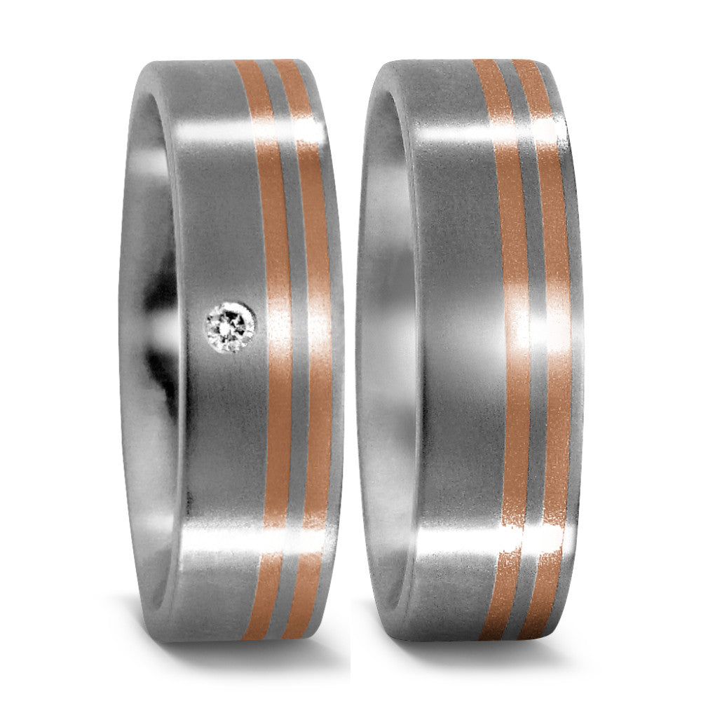 Moderner Fingerring aus robustem Titan mit edlen Details aus 750er Rotgold. Das stilvolle Design mit zwei feinen Rotgoldstreifen verleiht dem Ring zeitlose Eleganz und perfekte Kombination aus Stärke und Schmuckkunst. Ideal für jeden Tag oder besondere Anlässe.