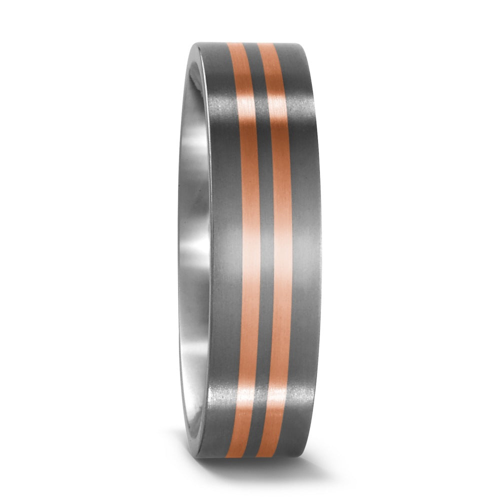 Moderner Fingerring aus robustem Titan mit edlen Details aus 750er Rotgold. Das stilvolle Design mit zwei filigranen Rotgoldstreifen verleiht dem Ring eine elegante und zeitgemäße Note – perfekt für besonderen Tragekomfort und ein markantes Statement.