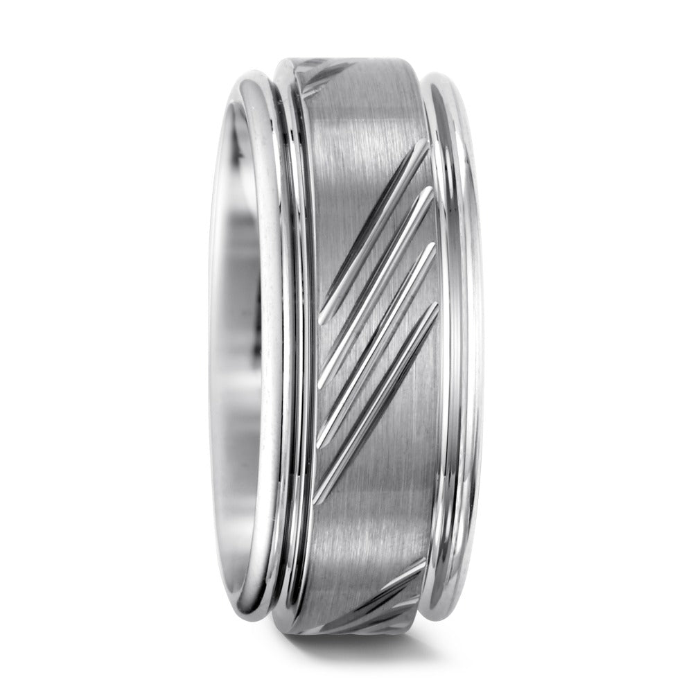 Moderner Herren-Fingerring aus hochwertigem Wolfram. Das Design kombiniert mattierte und glänzende Oberflächen mit eleganten Schliffen für einen stilvollen Look. Robust, kratzfest und hypoallergen – perfekt für den täglichen Gebrauch und besondere Anlässe.