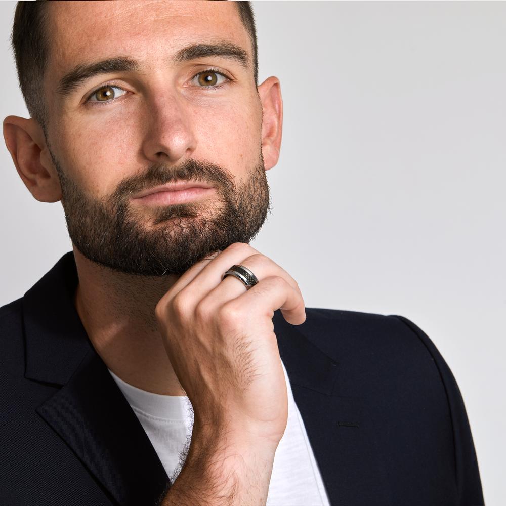 Moderner Herren Fingerring aus hochwertigem Wolfram mit einem markanten Carbon-Einsatz. Die Kombination aus robustem Wolfram und sportlich-schickem Carbon macht diesen Ring zum perfekten Accessoire für stilbewusste Männer. Langlebig und kratzfest – ideal für den Alltag.