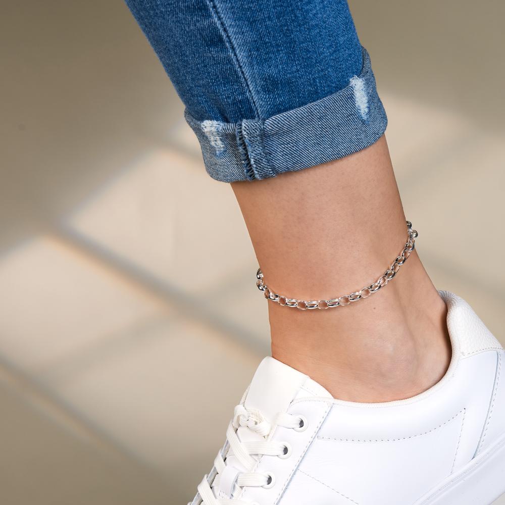 Elegantes Damen Fußkettchen aus hochwertigem Silber mit glänzenden Gliedern in ovaler Form. Verstellbare Länge für perfekten Sitz am Knöchel. Ein zeitloses Accessoire, das jedem Sommerlook eine feminine Note verleiht. Ideal für Strand, Freizeit oder festliche Anlässe.