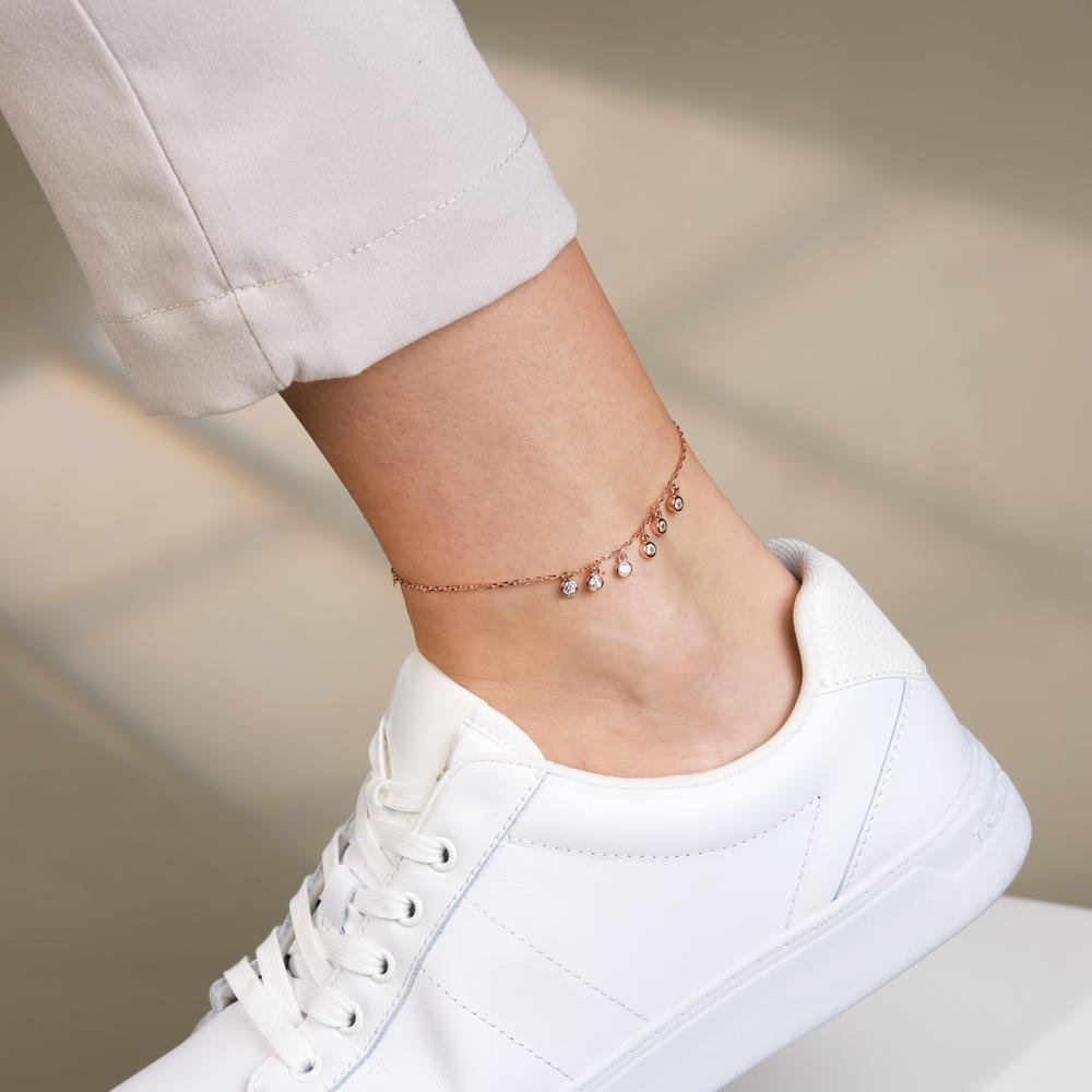 Elegantes Damen Fußkettchen aus hochwertigem rosévergoldetem Silber, verziert mit funkelnden Zirkonia-Steinen. Das zarte Design mit kleinen Anhängern sorgt für einen stilvollen und femininen Look. Verstellbare Länge für perfekten Sitz – ideal für Sommer und besondere Anlässe.