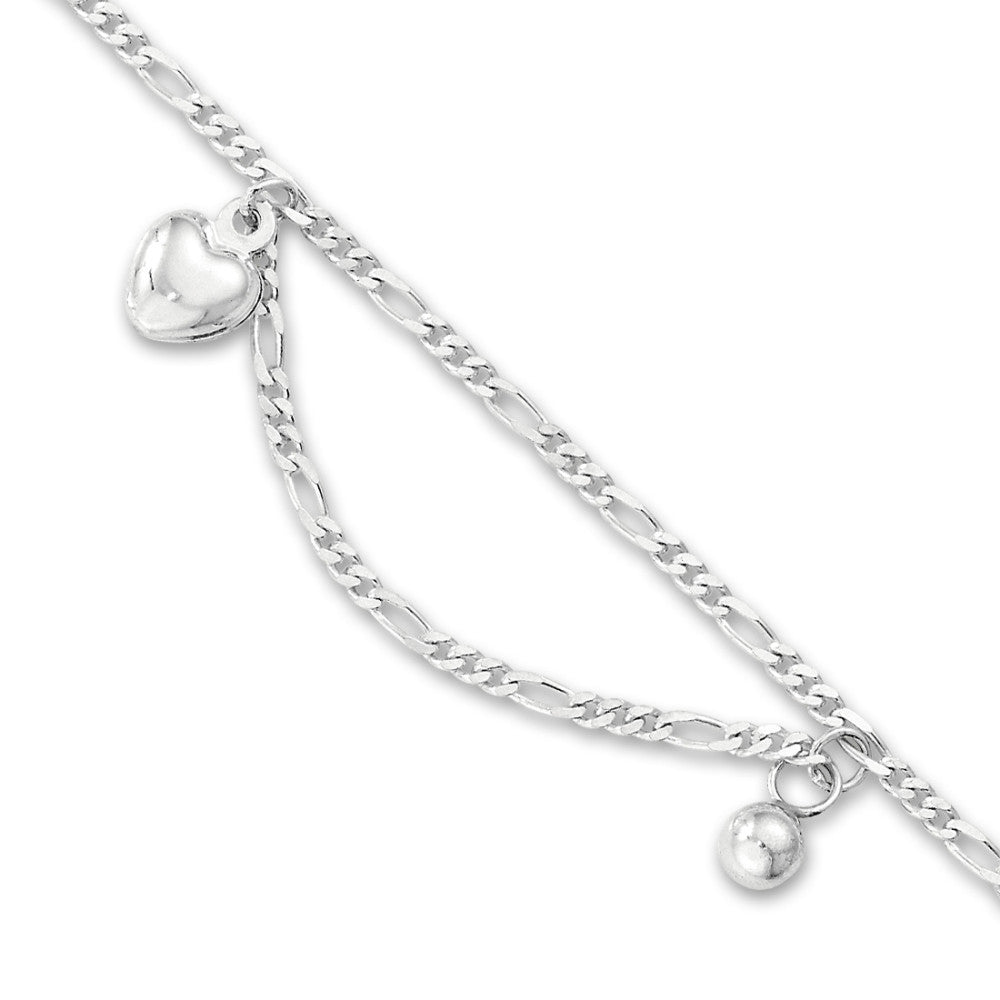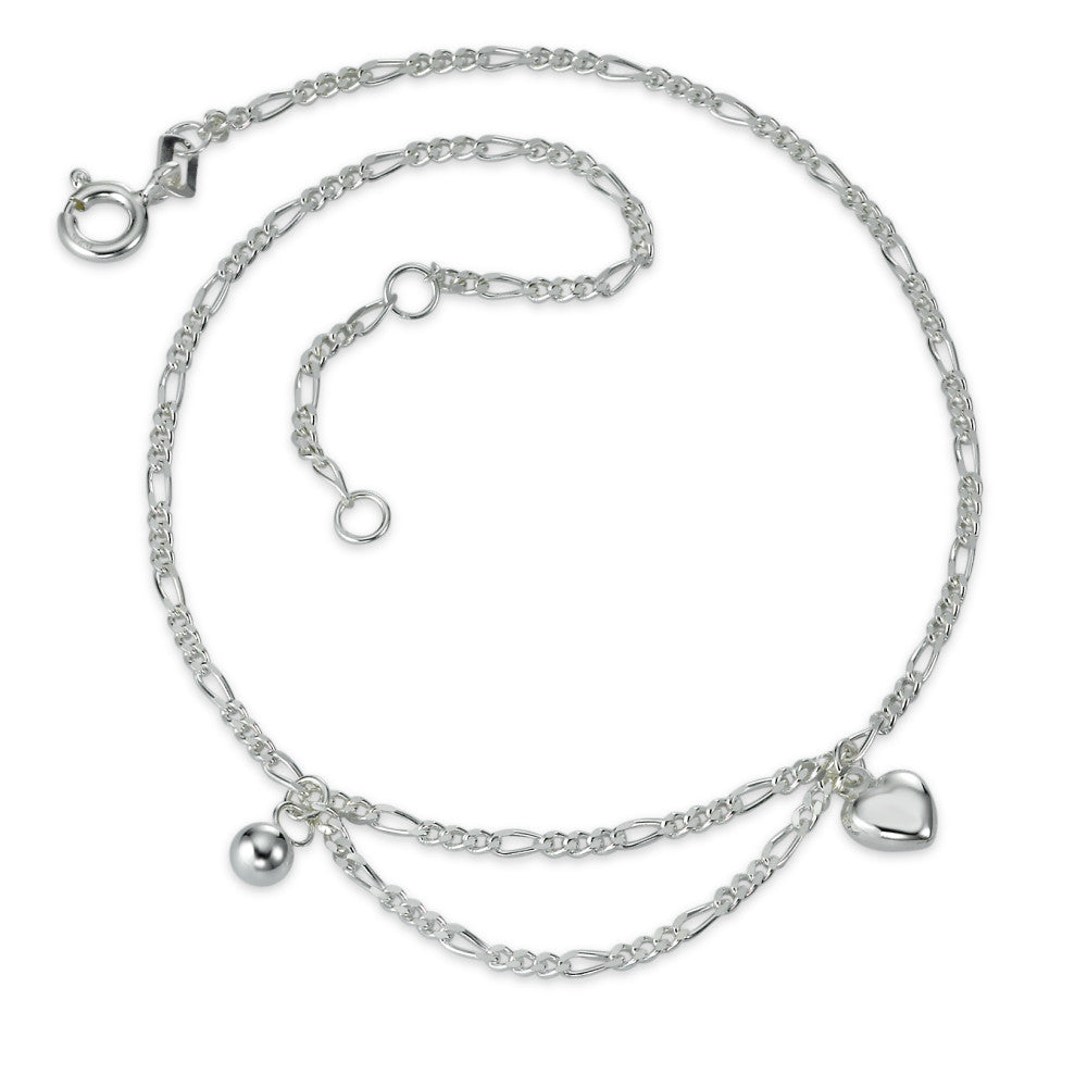 Elegantes Damen Fußkettchen aus hochwertigem Silber mit feinem Gliederdesign. Verziert mit einem zarten Herz-Anhänger und einer kleinen Kugel, verleiht es jedem Sommeroutfit eine feminine Note. Verstellbare Länge für perfekten Sitz und stilvollen Look.
