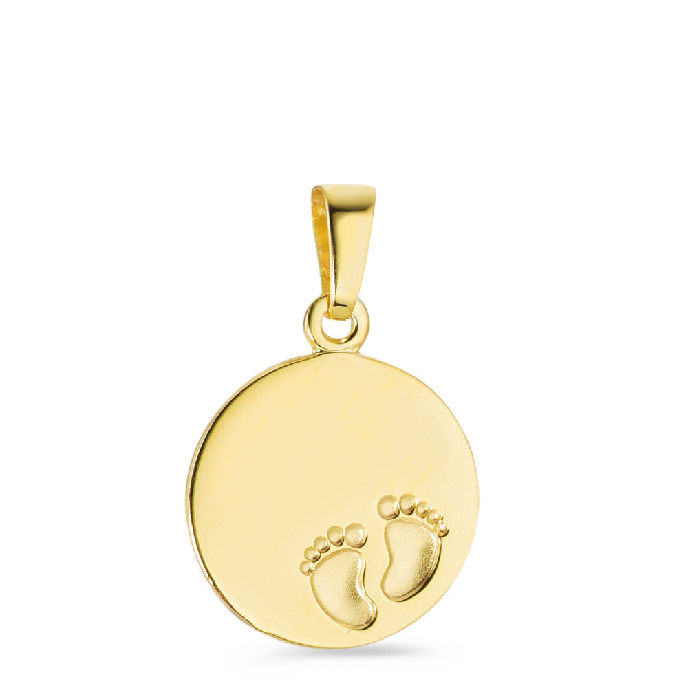 Zauberhafter Baby Gravuranhänger aus 375 Gelbgold mit süßen Babyfüßchen-Motiv. Ideal als persönliches Geschenk zur Geburt oder Taufe. Der runde Anhänger bietet Platz für eine individuelle Gravur und wird so zum einzigartigen Erinnerungsstück.