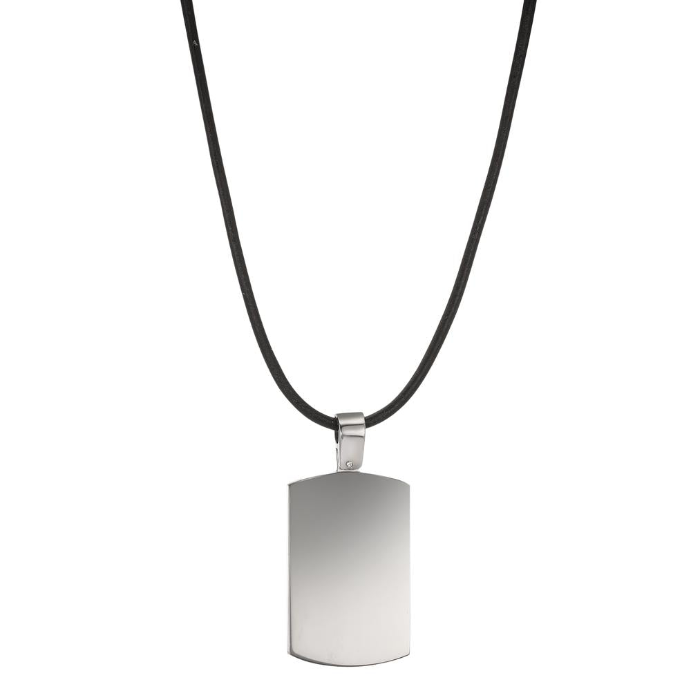 Stylische Herren-Halskette aus robustem Edelstahl kombiniert mit einem schwarzen Lederband. Der schlichte Anhänger besticht durch sein modernes, zeitloses Design und lässt sich individuell gravieren. Perfekt für jeden Anlass und ein markantes Accessoire für Männer, die Stil und Qualität schätzen.