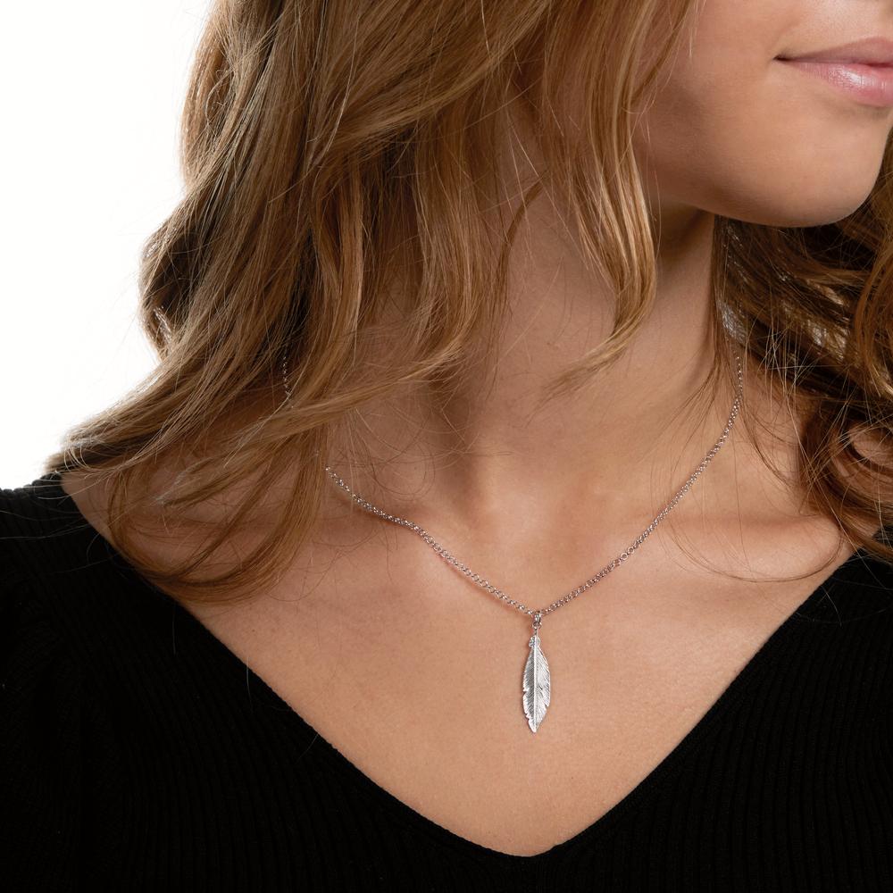 Elegante Damen-Halskette aus Silber mit filigran gestaltetem Feder-Anhänger. Ein stilvolles Accessoire, das jedem Outfit eine natürliche Leichtigkeit verleiht. Perfekt für den Alltag und besondere Anlässe – zeitlos und modern zugleich.
