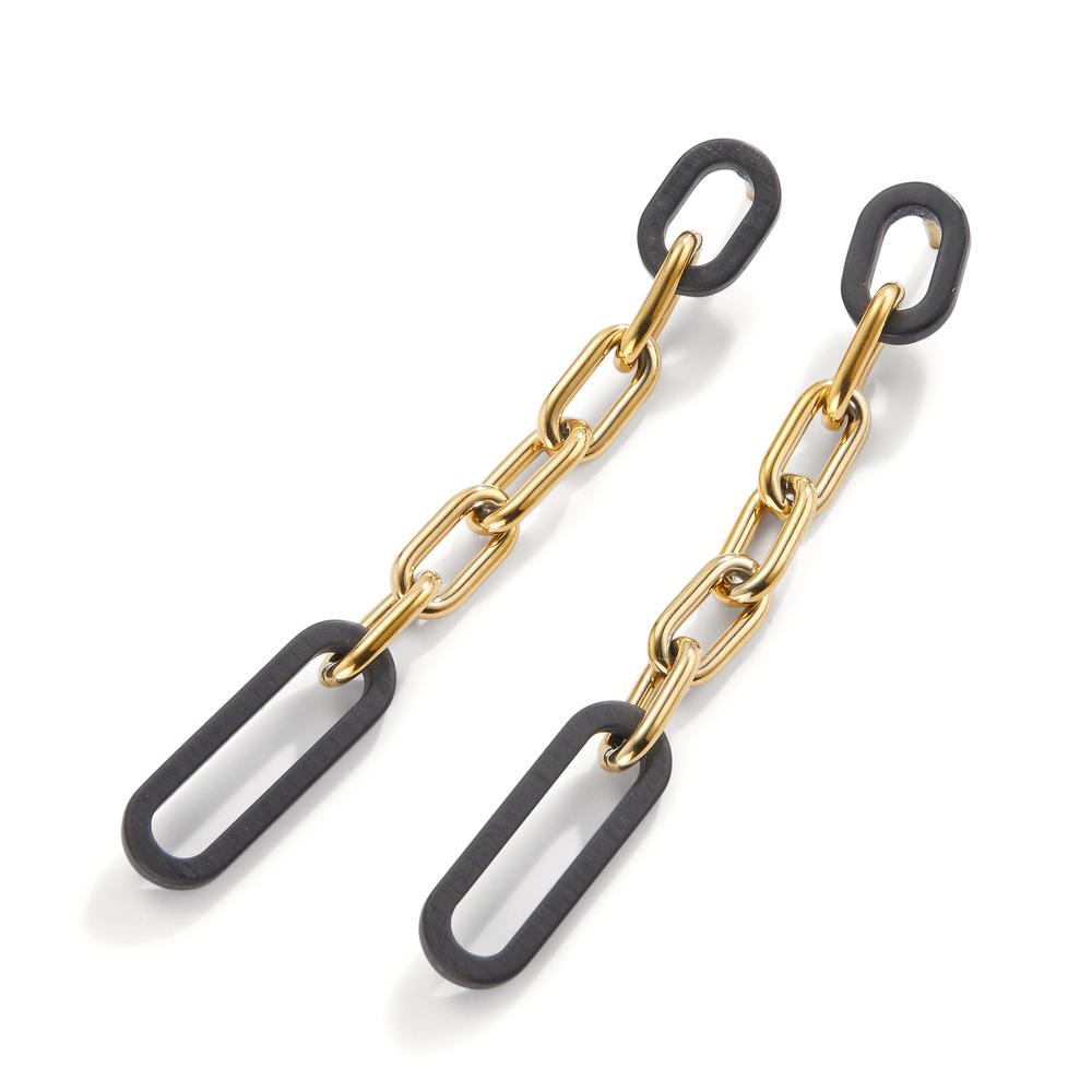 Diese eleganten Damen Ohrhänger kombinieren robusten Edelstahl mit modernem Carbon-Design. Die goldfarbenen Kettenglieder setzen einen stilvollen Akzent und sorgen für einen trendigen Look. Leicht und angenehm zu tragen, sind sie perfekt für jeden Anlass.