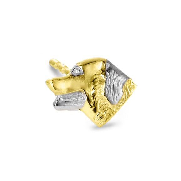 Dieser Herren Ohrstecker aus 750er Gelbgold zeigt detailreich das Profil eines Hundes. Ein stilvolles Accessoire für Tierliebhaber, das durch seine edle Verarbeitung und das zweifarbige Design besticht. Ein einzelner Ohrstecker für einen individuellen Look.