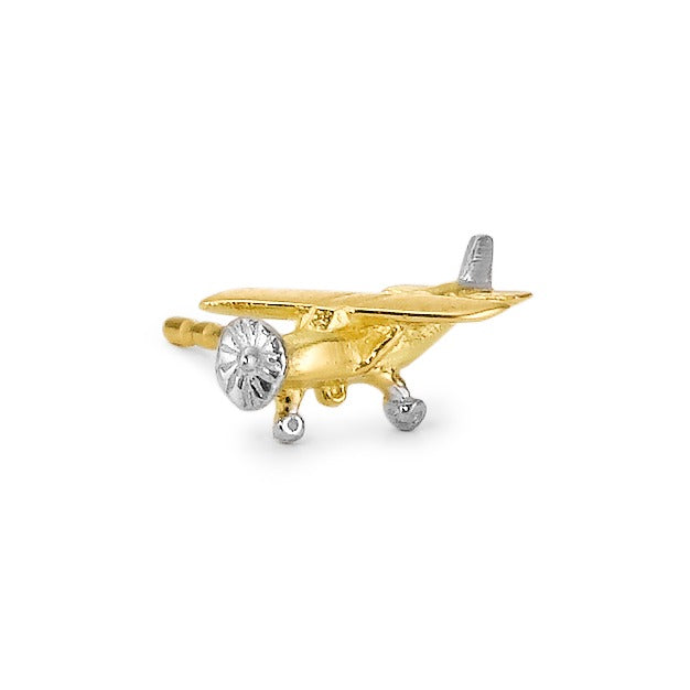 Stilvoller Herren Ohrstecker aus 750er Gelbgold in Form eines Propellerflugzeugs. Ein einzigartiges Accessoire für Flugzeugliebhaber und Individualisten. Perfekt für den Alltag oder besondere Anlässe – eleganter Metallglanz trifft auf detailreiche Verarbeitung.