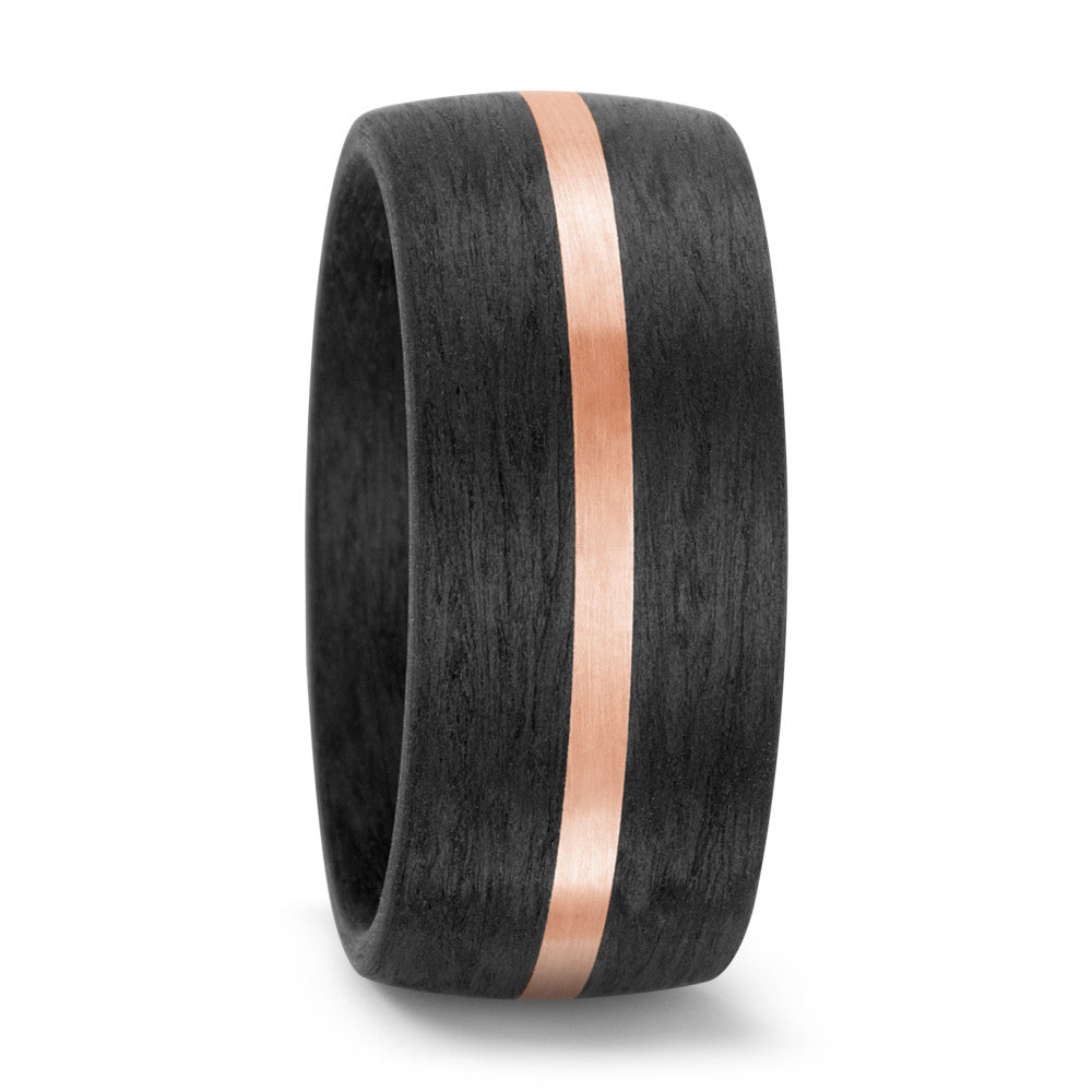 Moderner Partnerring aus langlebigem Carbon mit edlem Streifen aus 585er Roségold. Das Zusammenspiel von mattem Schwarz und warmem Rosé verleiht dem Ring eine besondere Eleganz. Ideal für Paare, die zeitlosen Stil und Individualität lieben.