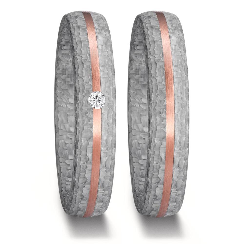 Eleganter Damen-Partnerring aus 585er Roségold kombiniert mit modernem Carbon. Das schmale Roségold-Inlay setzt einen warmen Akzent, während ein funkelnder Diamant die edle Optik perfektioniert. Ein stilvolles Symbol für besondere Verbundenheit.