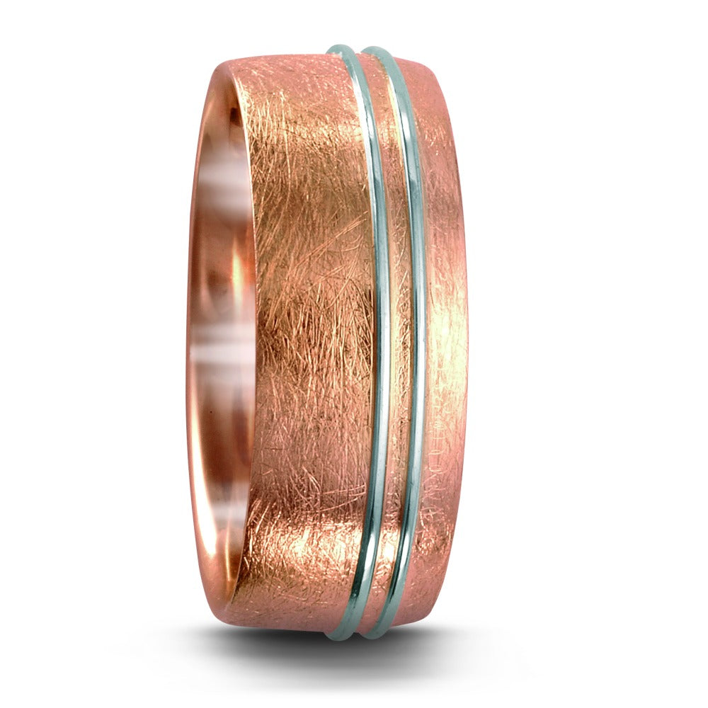 Moderner Herren-Partnerring aus hochwertigem Rotgold mit zwei eleganten Platinstreifen. Die matte, strukturierte Oberfläche verleiht dem Ring einen individuellen Look. Perfekt für stilbewusste Männer, die Wert auf Qualität und zeitloses Design legen. Ideal als Symbol für Verbundenheit.
