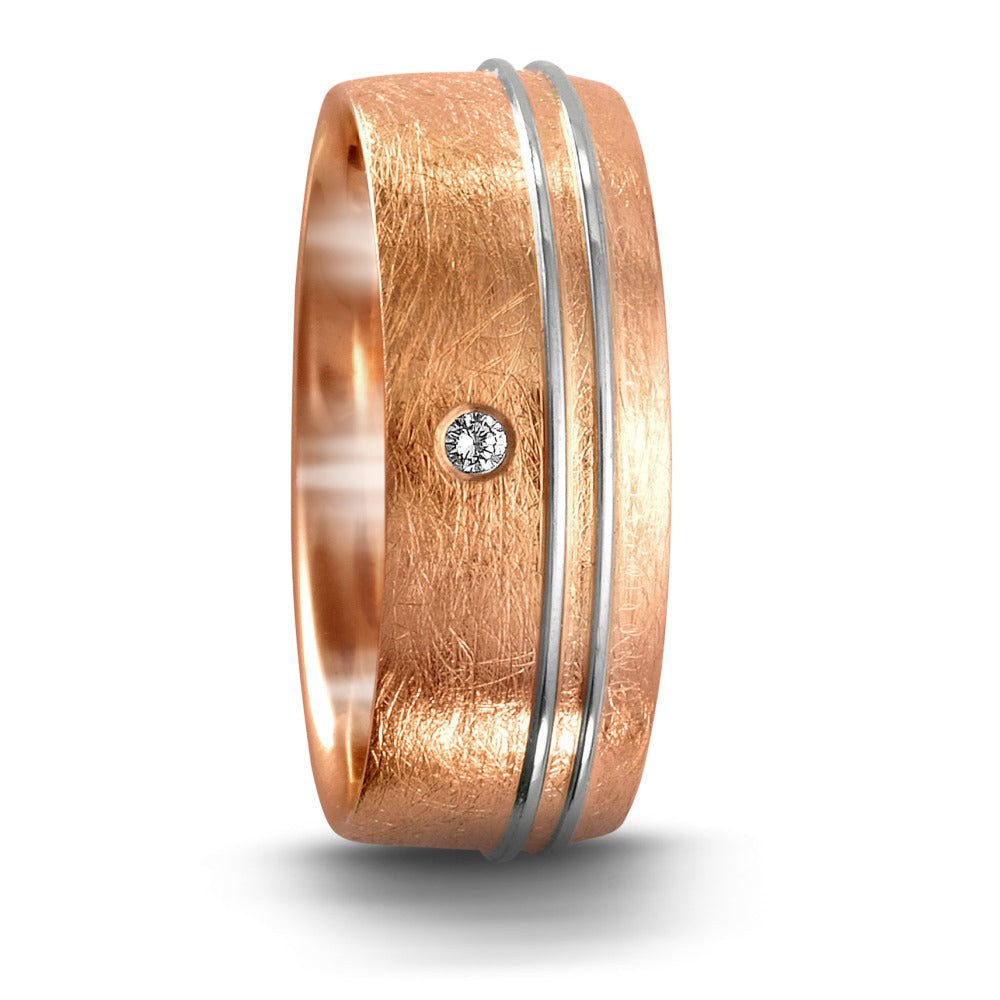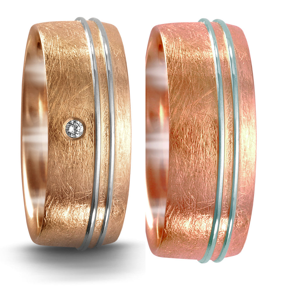 Eleganter Damen-Partnerring aus hochwertigem Rotgold mit zwei feinen Platinringen. Das markante Design wird durch einen strahlenden Diamanten veredelt. Moderne Handwerkskunst trifft auf zeitlose Eleganz – perfekt für besondere Momente.