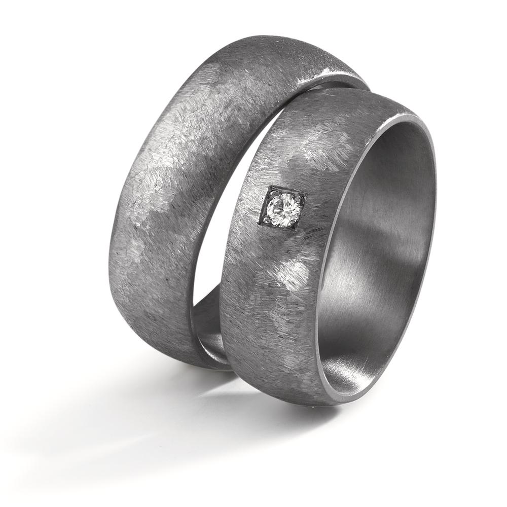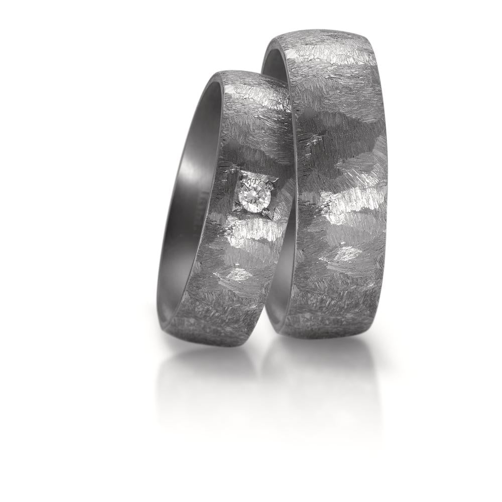 Eleganter Damen-Partnerring aus 999er Tantal mit markant strukturierter Oberfläche. Dezenter Diamant kunstvoll eingefasst, verleiht diesem Ring zeitlose Schönheit und Individualität. Perfekt, um besondere Momente stilvoll zu symbolisieren.