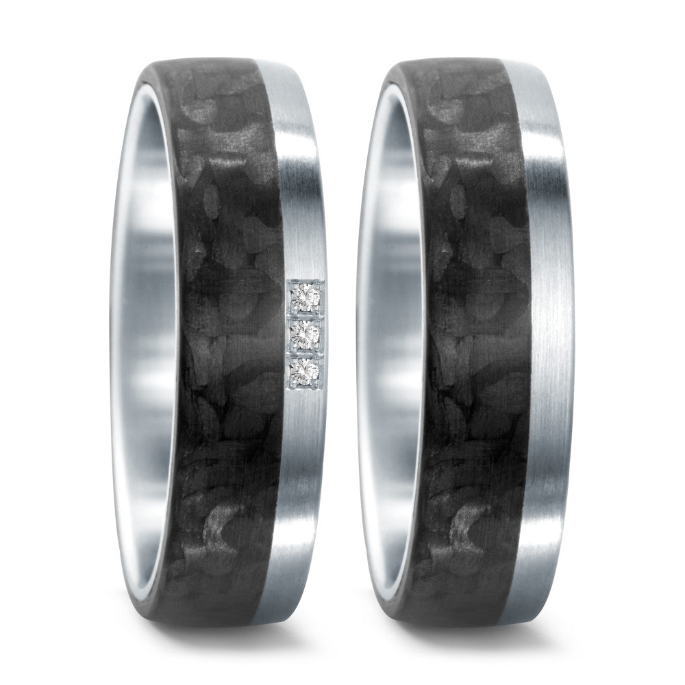 Eleganter Damen-Partnerring aus hochwertigem Edelstahl kombiniert mit edlem Carbon. Veredelt wird der Ring durch drei funkelnde Diamanten, die ihm eine zeitlose und moderne Note verleihen. Ideal als Symbol für Verbundenheit und Stil.