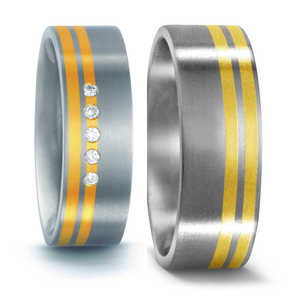 Moderner Partnerring aus robustem Titan, veredelt mit zwei eleganten Streifen aus 750er Gelbgold. Die Kombination aus mattiertem Titan und warmem Gold schafft einen stilvollen Kontrast. Perfekt für Paare, die Qualität und Design schätzen. Zeitlos und langlebig für den Alltag.