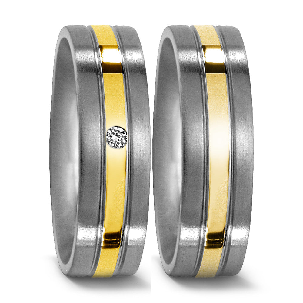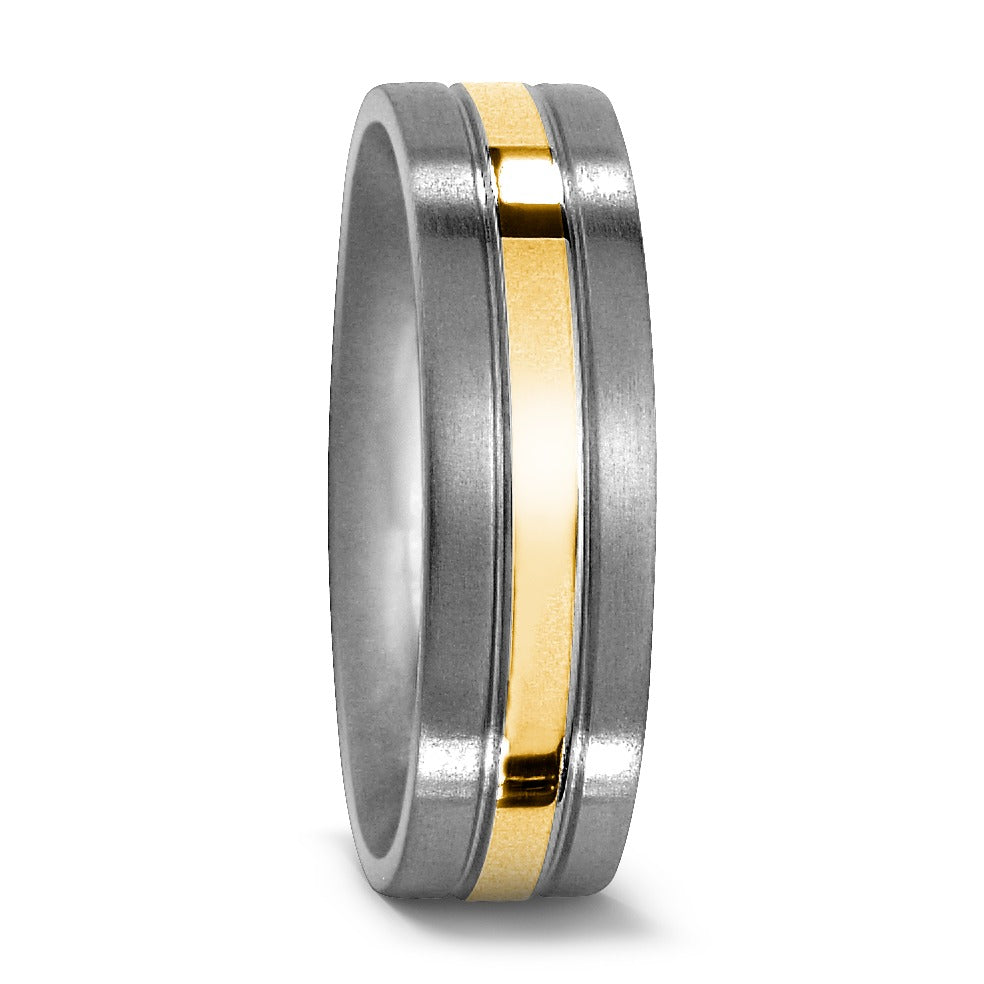 Entdecken Sie diesen eleganten Partnerring aus robustem Titan mit einer edlen Einlage aus 750er Gelbgold. Modernes Design trifft zeitlose Eleganz – perfekt für Paare, die Stil und Beständigkeit schätzen. Ideal als Symbol Ihrer Verbindung.
