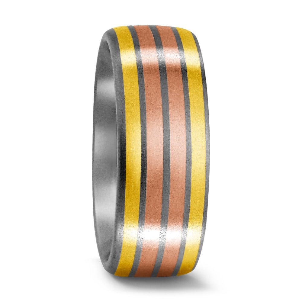 Zeitloser Partnerring aus robustem Titan mit edlen Einlagen aus 750er Gelb- und Rotgold. Die Kombination der warmen Goldtöne mit dem matten Titan verleiht dem Ring eine moderne und elegante Optik – perfekt für symbolträchtige Momente zu zweit.