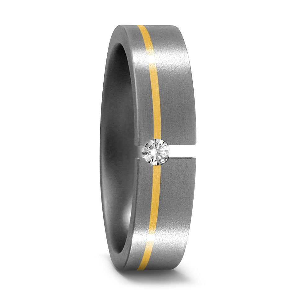 Edler Damen-Partnerring aus langlebigem Titan mit einem eleganten 750er Gelbgoldstreifen. Verziert mit einem funkelnden Diamanten, vereint dieser Ring moderne Schlichtheit und zeitlose Eleganz – das perfekte Symbol für Ihre Partnerschaft.