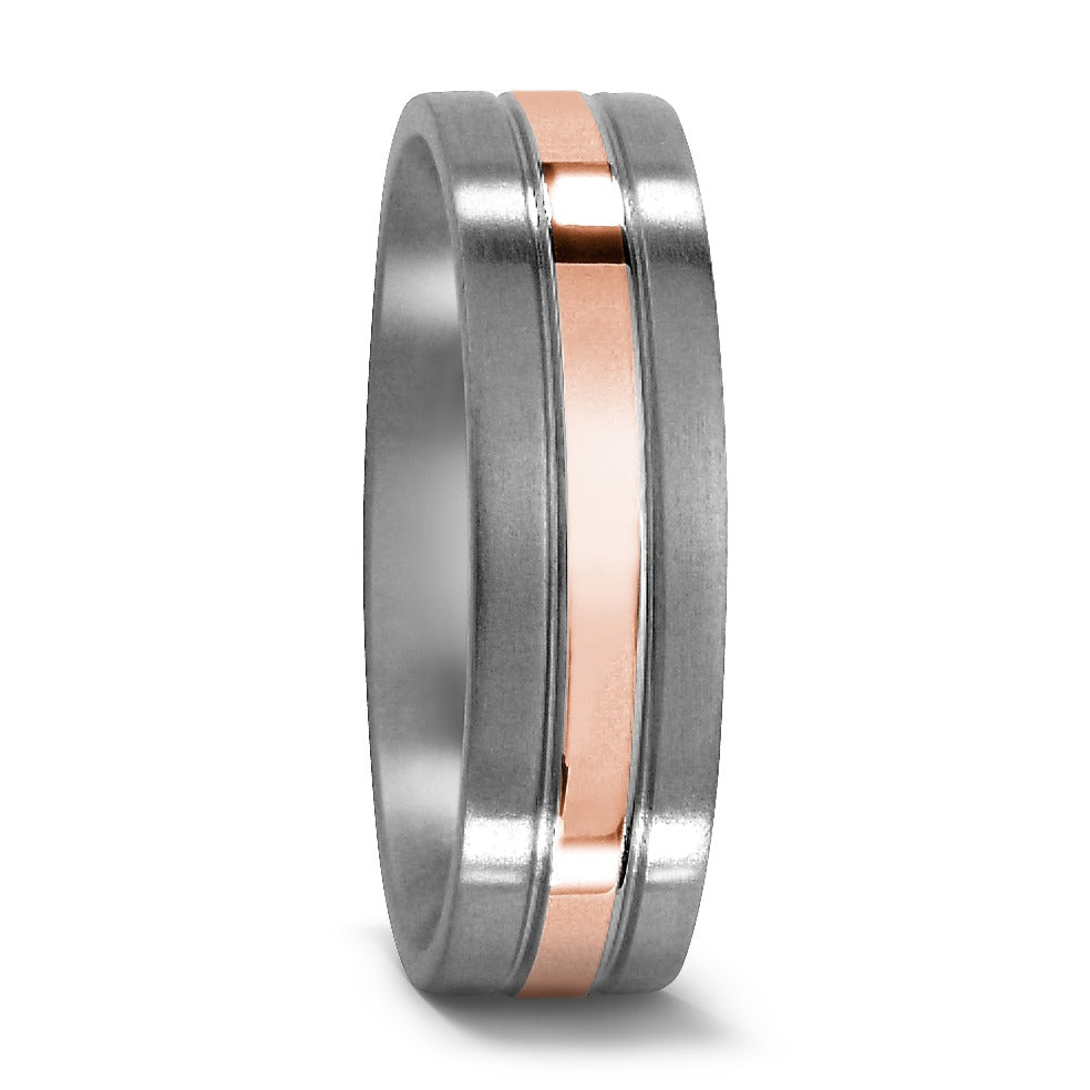 Moderner Partnerring aus robustem Titan mit eleganter, polierter 750 Rotgold-Einlage. Die Kombination aus zeitlosem Design und hochwertigen Materialien macht diesen Ring zum perfekten Symbol für Beständigkeit und Liebe. Ideal für Paare, die Wert auf Stil und Qualität legen.