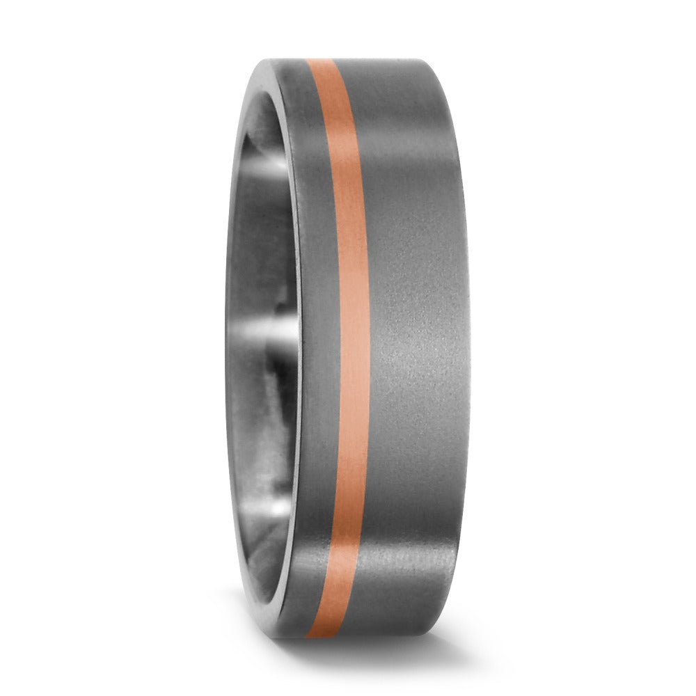 Moderner Partnerring aus robustem Titan mit edlem Akzent in 750er Rotgold. Der matte Grauton des Titans harmoniert stilvoll mit dem warmen Rotgoldstreifen – ideal für Paare, die zeitlose Eleganz und Langlebigkeit schätzen. Perfekt für den gemeinsamen Weg.